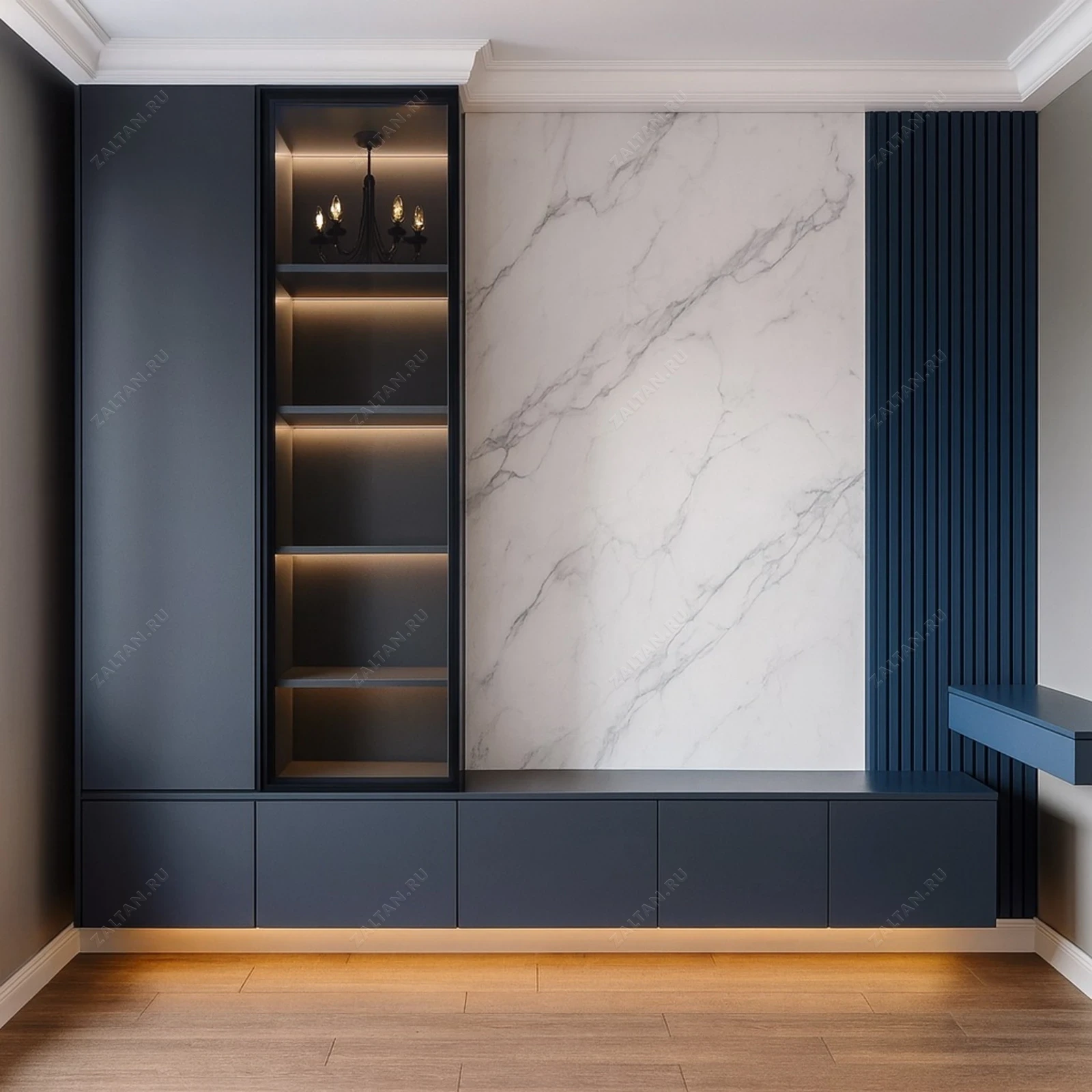 Элегантная модульная стенка под ТВ с открытой витриной и мраморной декоративной панелью. Изготовление по индивидуальным размерам, премиальные материалы и точная подгонка под интерьер.