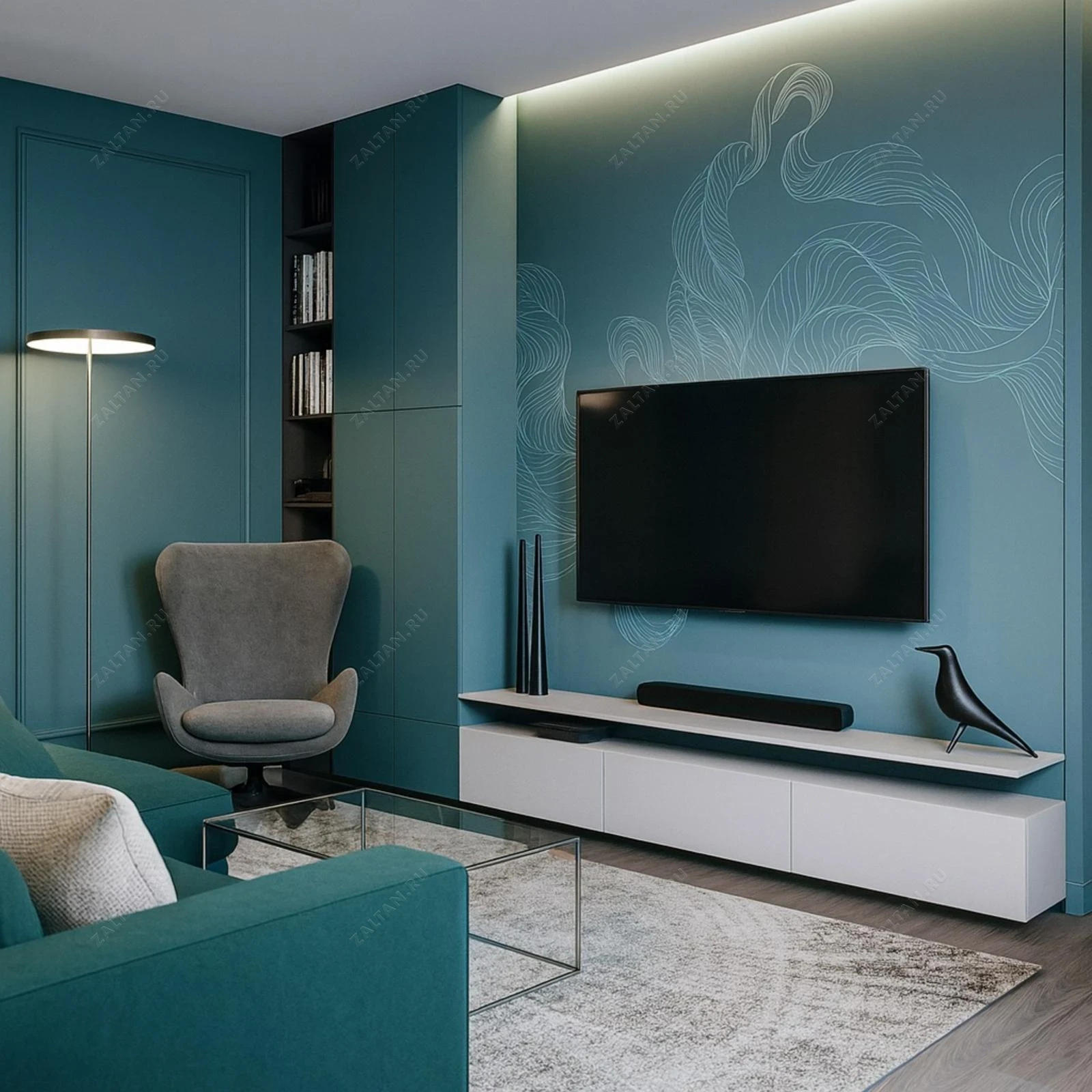 Современная модульная стенка для гостиной — решение премиум-класса для хранения и размещения техники. Комплект сочетает высокий встроенный пенал с открытыми полками и подвесную тумбу под ТВ, выполненные в сдержанной цветовой гамме.