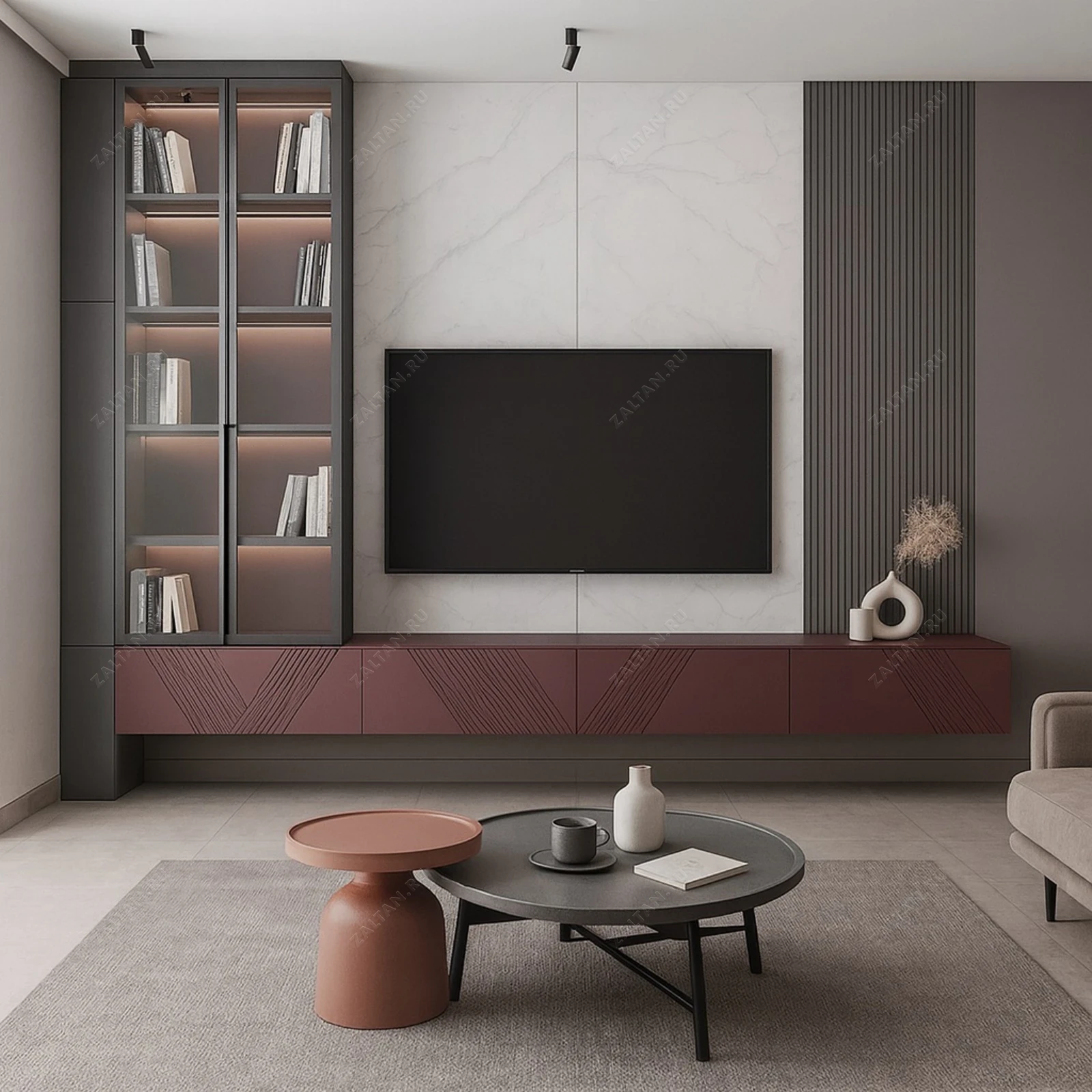 Современная модульная стенка под ТВ с витриной — решение для тех, кто ценит премиальную отделку и функциональность. Композиция объединяет подвесную тумбу с фрезерованными фасадами и высокий стеклянный шкаф с подсветкой.