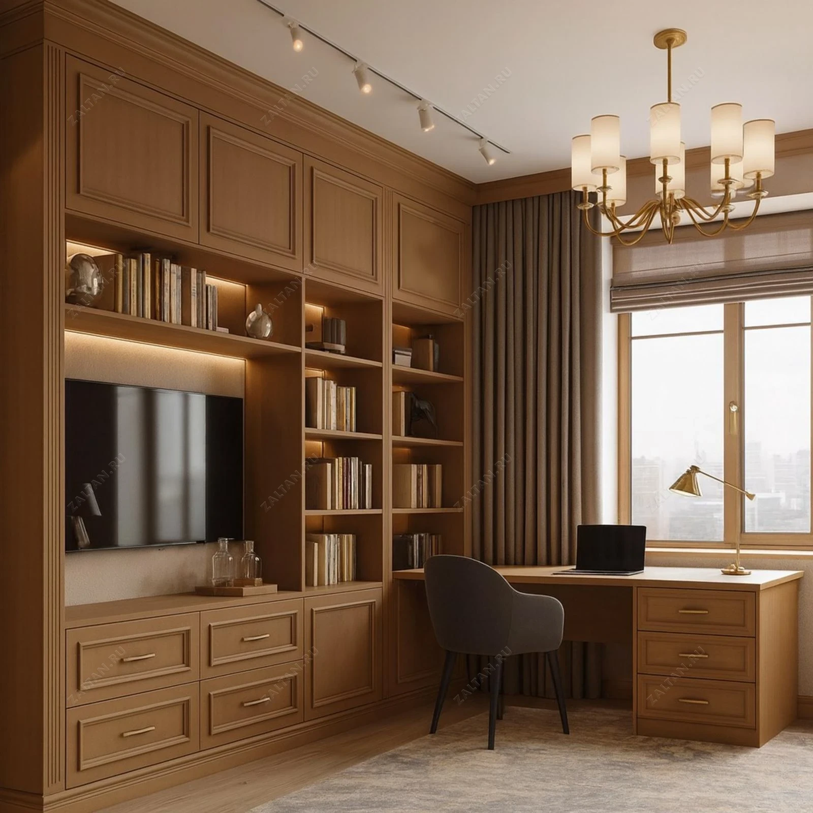 Премиальная встроенная стенка с рабочей зоной — индивидуальное решение для кабинета или домашней библиотеки. Корпус и фасады выполнены в тёплом древесном тоне с филёнками и фрезеровкой, встроенная подсветка подчёркивает полки и нишу для ТВ.