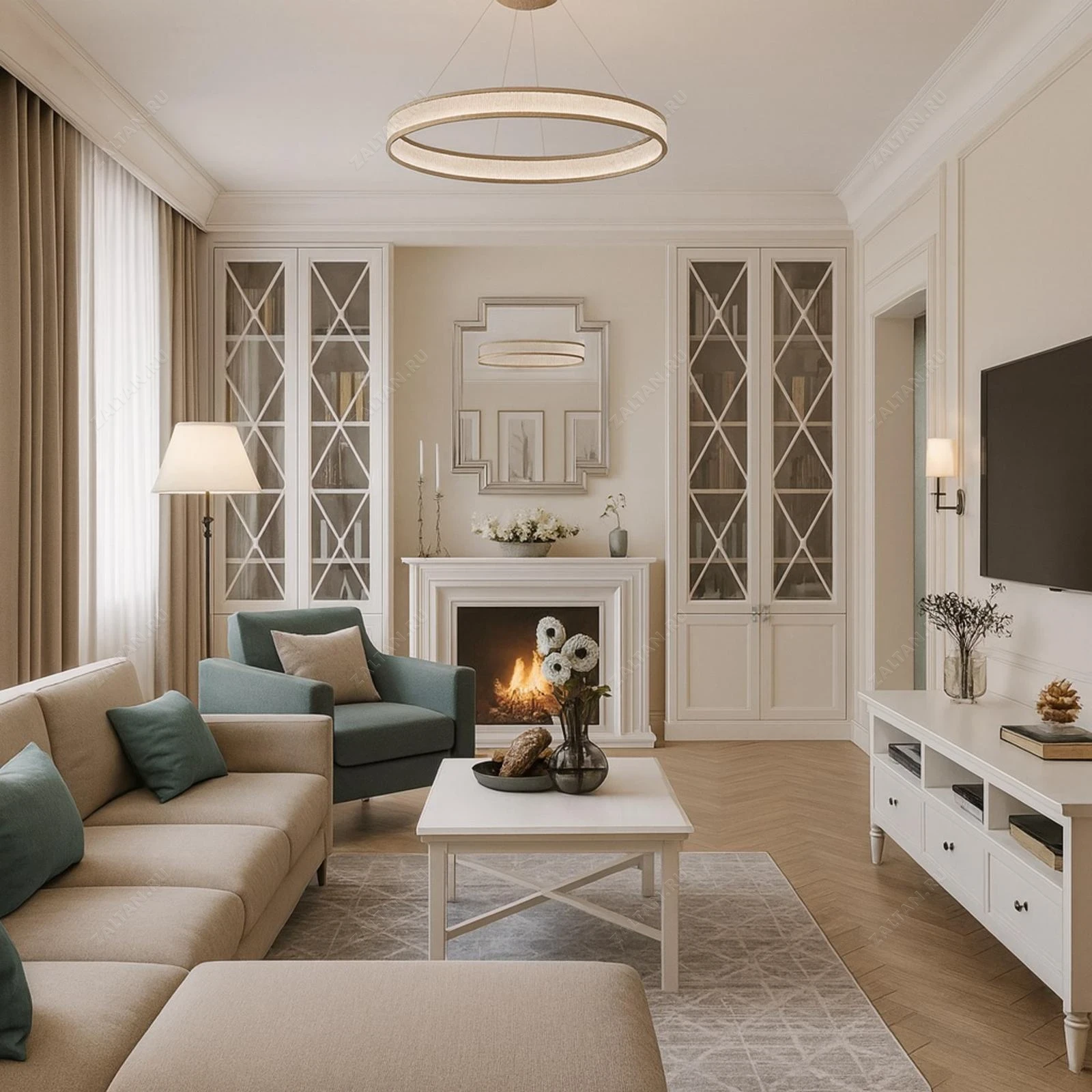 Комплект мебели в неоклассическом стиле: пара высоких витрин с раскладкой и стеклянными фасадами по бокам каминной облицовки, низкая тумба под ТВ и кофейный стол. Выполняется по индивидуальным размерам, акцент на качественной отделке и точной подгонке в нишу.