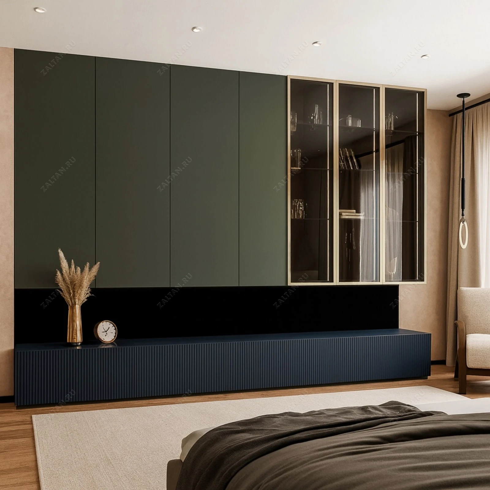 Модульная стенная система на заказ в премиальном исполнении. Верхние фасады — матовый МДФ глубокого зелёного тона, нижний блок — рифлёный фасад тёмно‑синего цвета. Витрина с тонированным стеклом в тонком алюминиевом профиле придаёт лёгкость и статус.