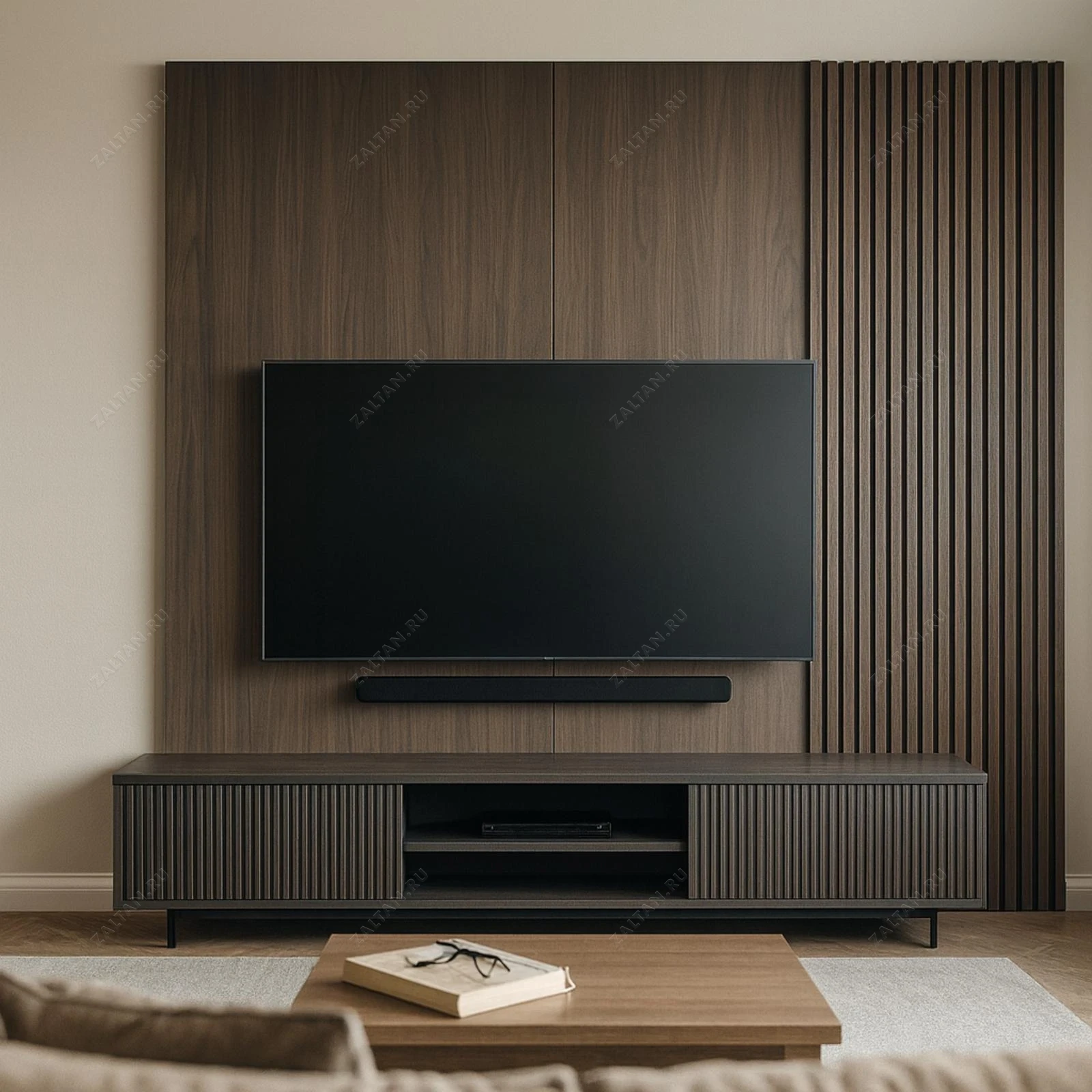 Дизайн изделия демонстрирует премиальный мультимедиакорпус для гостиной: панель под телевизор из шпона тёмного оттенка и низкая тумба с реечными фасадами. Концепция — лаконичная минималистичная отделка, аккуратный кабель-канал за панелью и открытые полки для AV-техники.