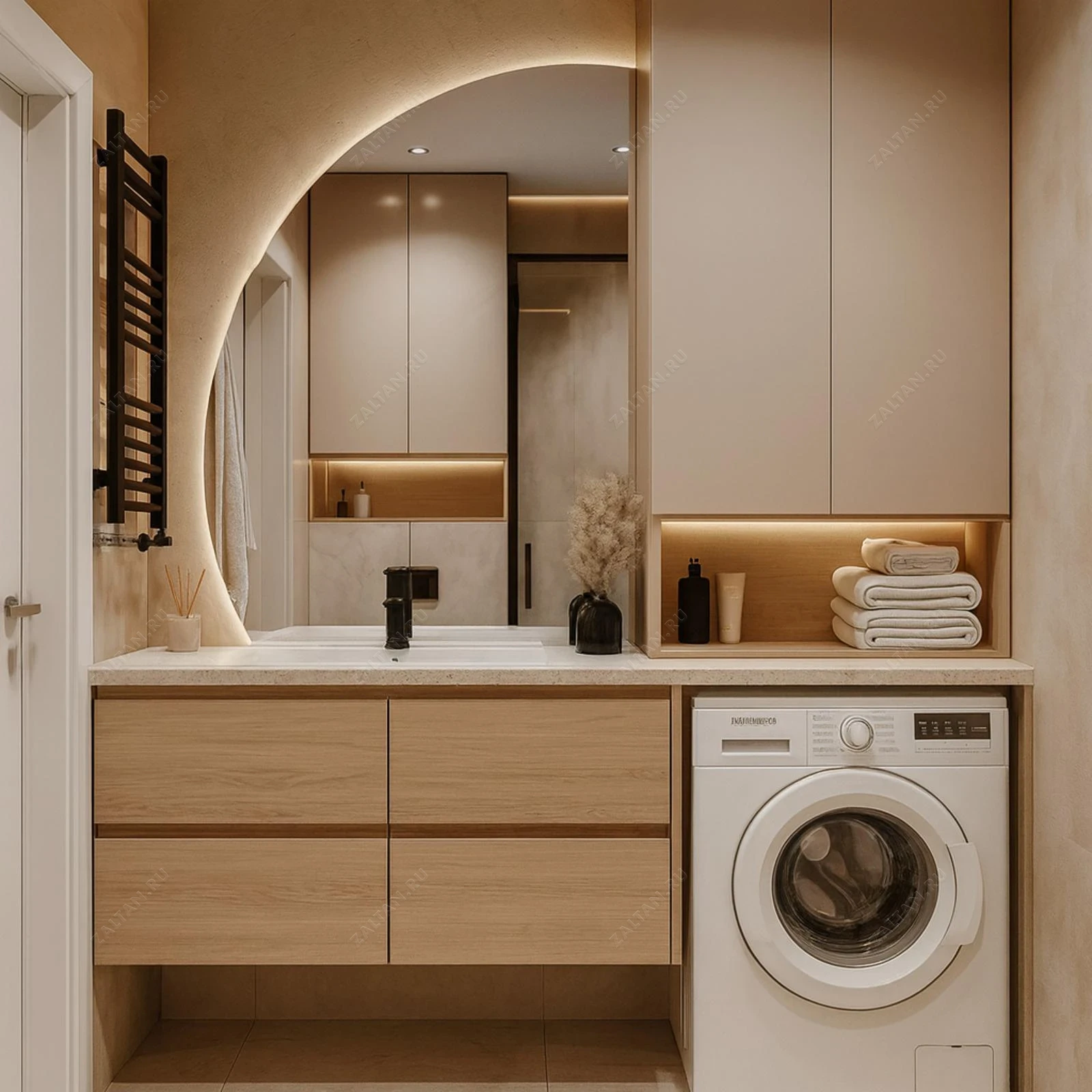 Компактная мебель для ванной комнаты — тумба с встраиваемым местом под стиральную машину и подвесными шкафами по всей высоте. Изготовление на заказ в индивидуальных размерах позволяет учесть габариты сантехники и особенностей помещения.