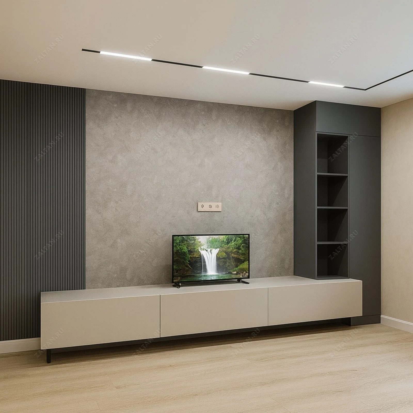 Модульная композиция для гостиной: низкая тумба под телевизор и высокий пенал с открытыми полками. Чистые геометрии и матовые фасады делают решение универсальным для современного интерьера.