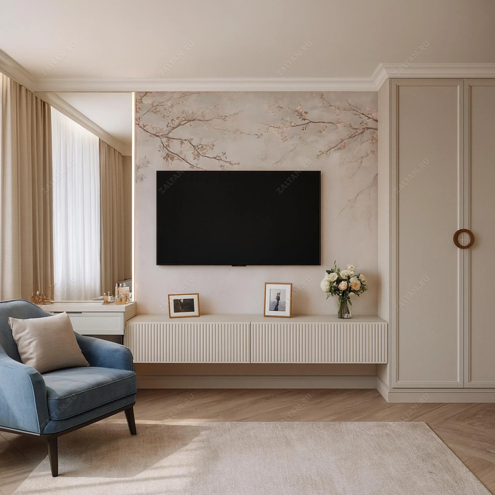Изящная модульная система для гостиной: подвесная тумба с рифлёным фасадом и высокий встроенный шкаф в одной композиции. Выполняется по индивидуальным размерам, идеальна для хранения техники и одежды.