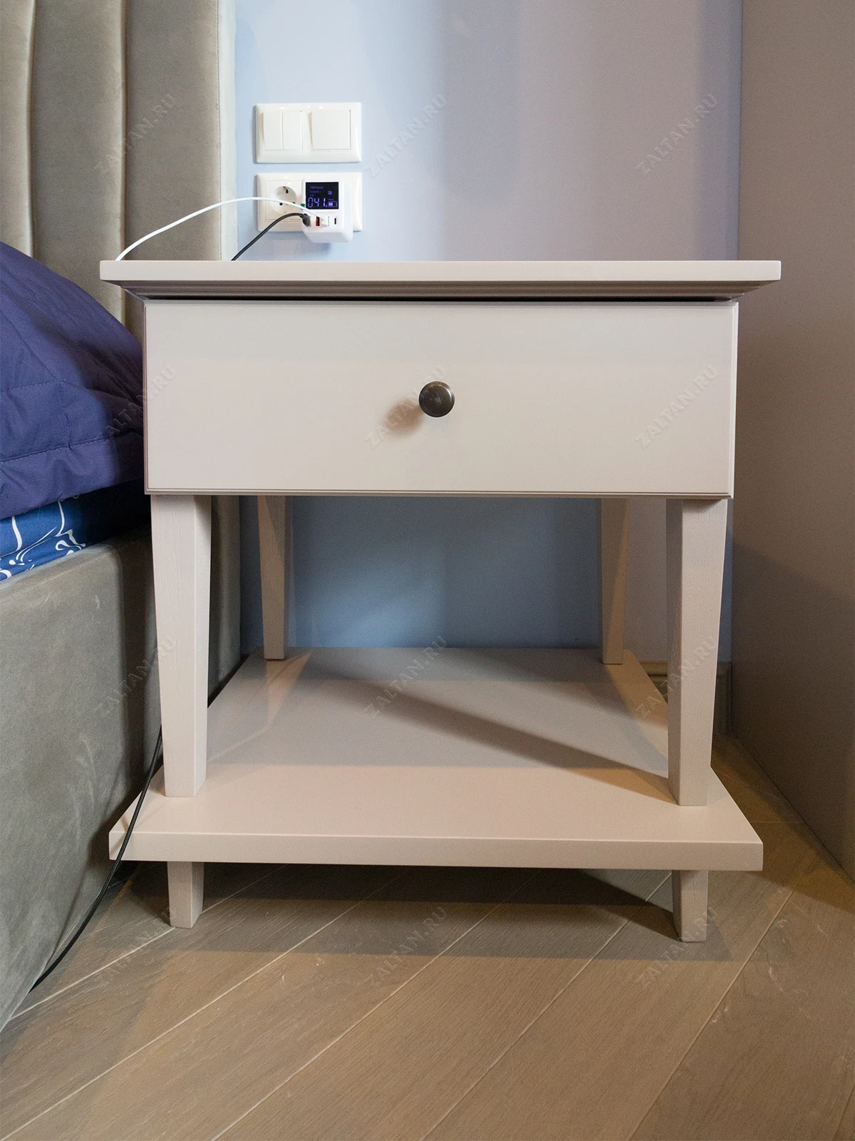 Тумба оснащена одним выдвижным ящиком и открытой полкой, что делает ее практичной для хранения необходимых мелочей, таких как книги, очки, мобильный телефон и другие предметы, которые могут понадобиться в ночное или утреннее время. Ручка ящика подобрана в тон мебели, подчеркивая ее элегантность и минимализм.