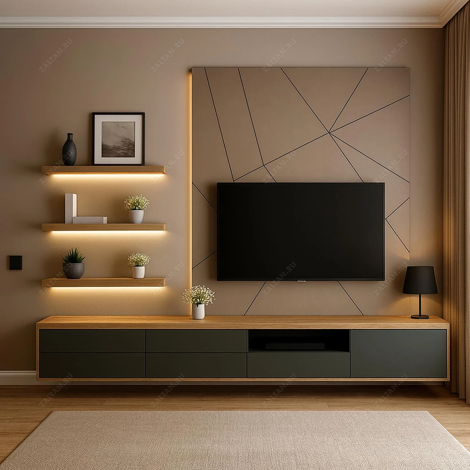 Элегантная модульная ТВ-зона на заказ: подвесная тумба с матовыми фасадами и фрезерованной декоративной панелью с геометрическим узором. Идеальное решение для гостиной в стиле минимализм — компактно скрывает технику и кабели, обеспечивает место для декора на подсвечиваемых полках.