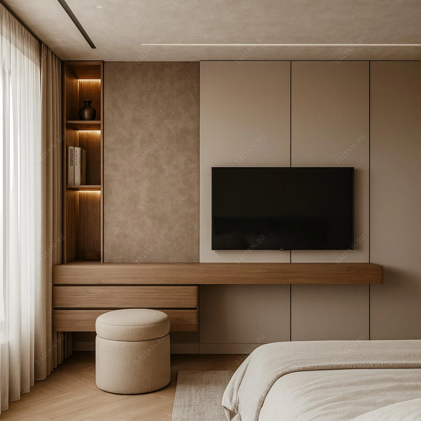 Современная ТВ-зона с тонкими вертикальными панелями и подвесной тумбой — решение для спальни или гостиной. Минималистичный шкаф-панель объединяет нишу со встроенными полками, подсветкой и тремя выдвижными ящиками. Комбинация матовой крашеной панели и шпонированного корпуса придаёт тёплый, премиальный вид.