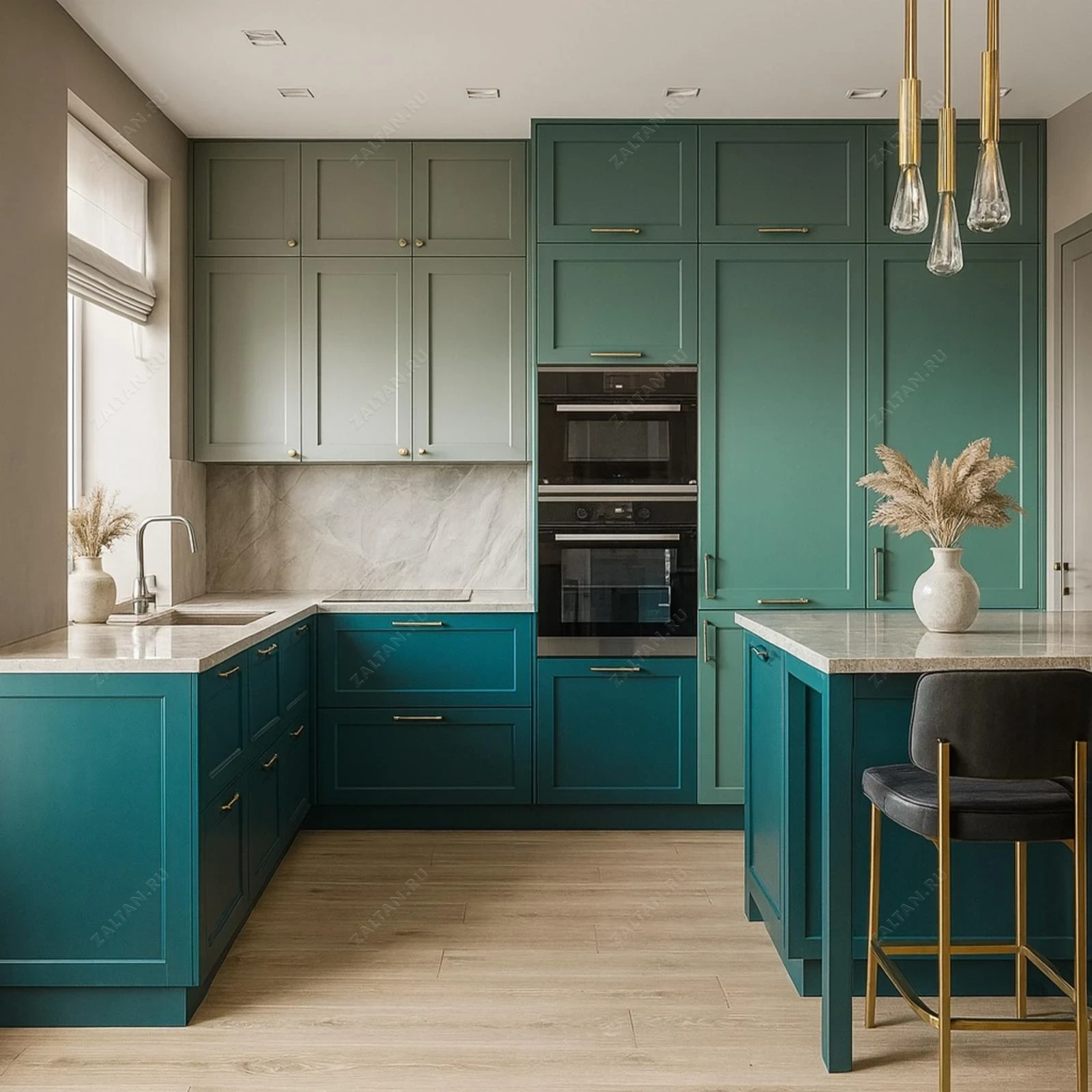 Элегантная угловая кухня в глубоком зелёно-голубом оттенке с компактным островом — пример премиальной мебели под заказ. Фасады — рамочные МДФ с фрезеровкой, матовая эмаль, латунная фурнитура. Столешница и фартук — камень/кварц, встроенная техника и глубокие ящики для посуды.