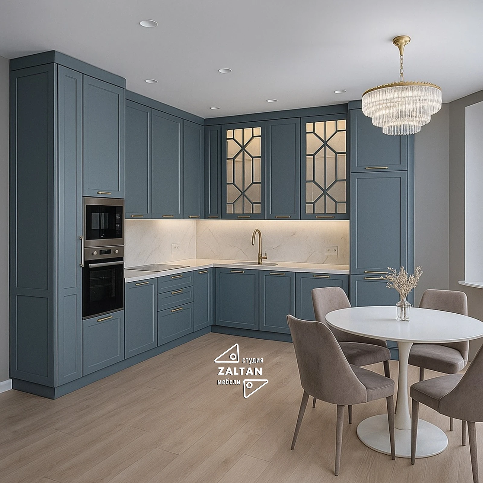 Индивидуальная угловая кухня премиум-класса в неоклассическом стиле. Выполнена из крашенного МДФ с декоративными стеклянными витринами и латунными ручками. Подходит для точной подгонки под проём и встроенной техники.