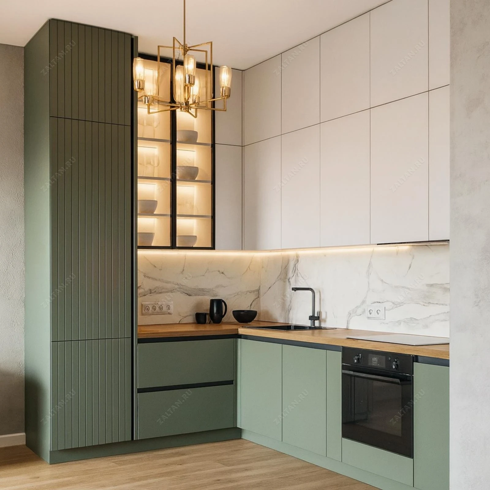 Современная угловая кухня на заказ: матовые зелёные нижние фасады в сочетании с белыми верхними до потолка и тонкой витриной с подсветкой. Фартук и столешница — имитация мрамора, контрастные чёрные ручки-канавки и алюминиевые рамки витрины.