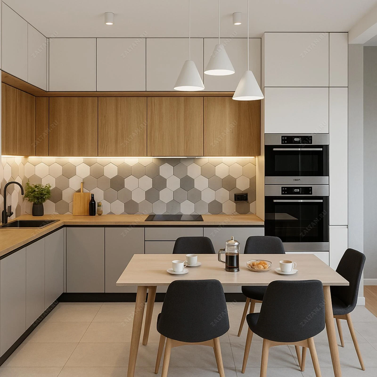 Современная угловая кухня премиум-класса, выполненная на заказ. Верхние фасады — тёплый дубовый шпон, нижние — матовый серый МДФ; интегрированные колонны для духовых шкафов и рабочая столешница в тон древесины. Решение оптимально для открытой планировки и столовой зоны.