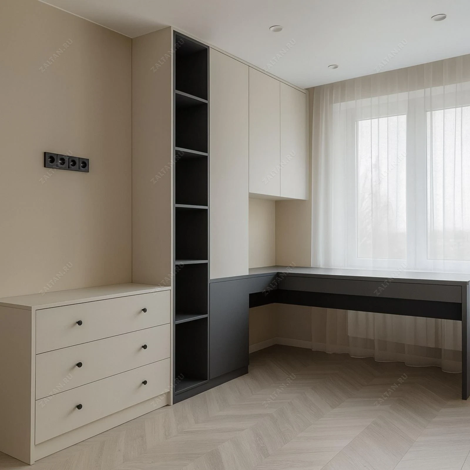 Угловая встроенная рабочая зона с низким комодом и вертикальным стеллажом. Лаконичный современный дизайн, фасады до потолка и глубокая рабочая поверхность у окна создают удобное место для работы и хранения.
