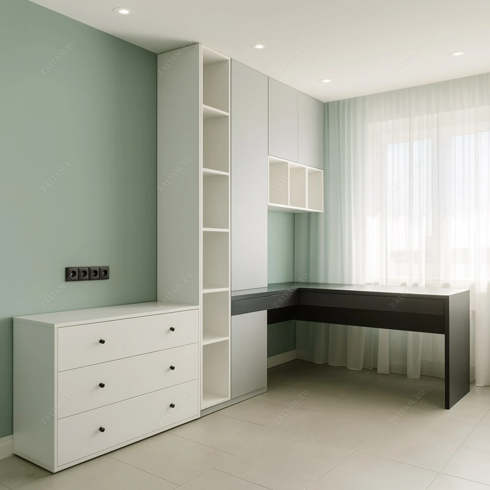 Компактный угловой кабинетный гарнитур по индивидуальным размерам: сочетание белых модулей и тёмной столешницы для чёткой графики и практичности.