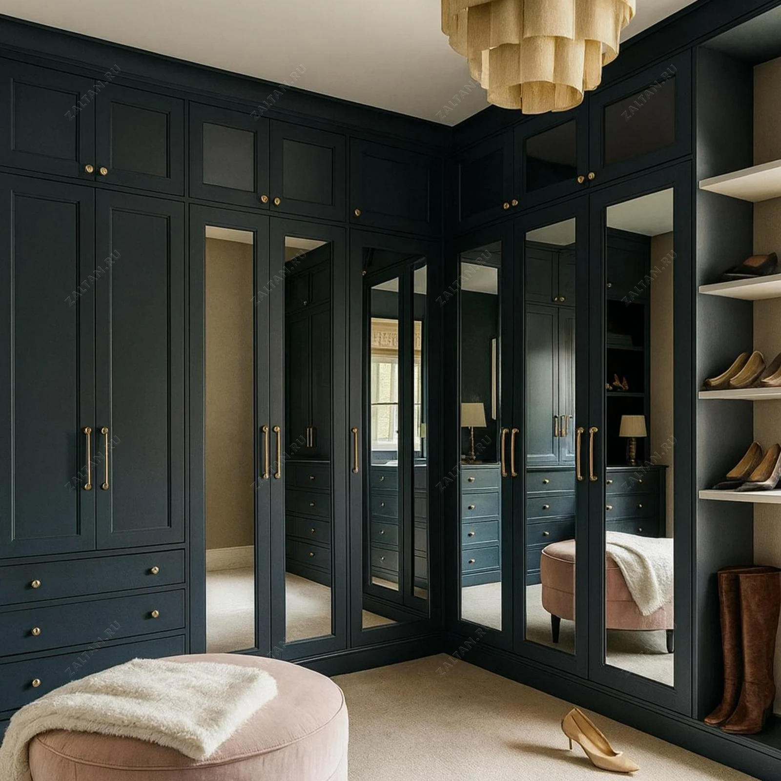 Темно-синяя угловая гардеробная — сочетание неоклассики и современного комфорта. Фасады из МДФ с матовой эмалью и фрезеровкой, зеркальные вставки и латунная фурнитура подчёркивают премиальный характер.