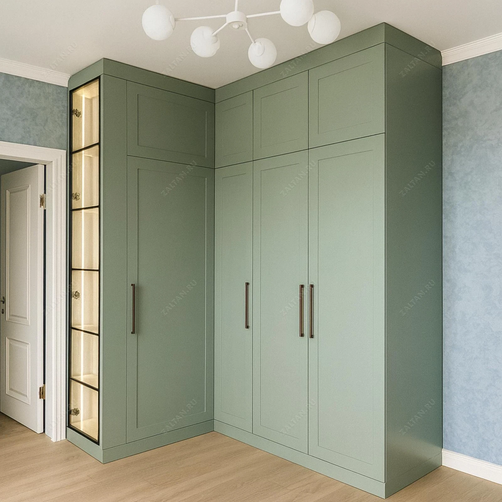 Элегантная угловая встроенная гардеробная в нежно‑зеленом цвете — решение для тех, кто ценит аккуратный неоклассический силуэт и продуманную функциональность.