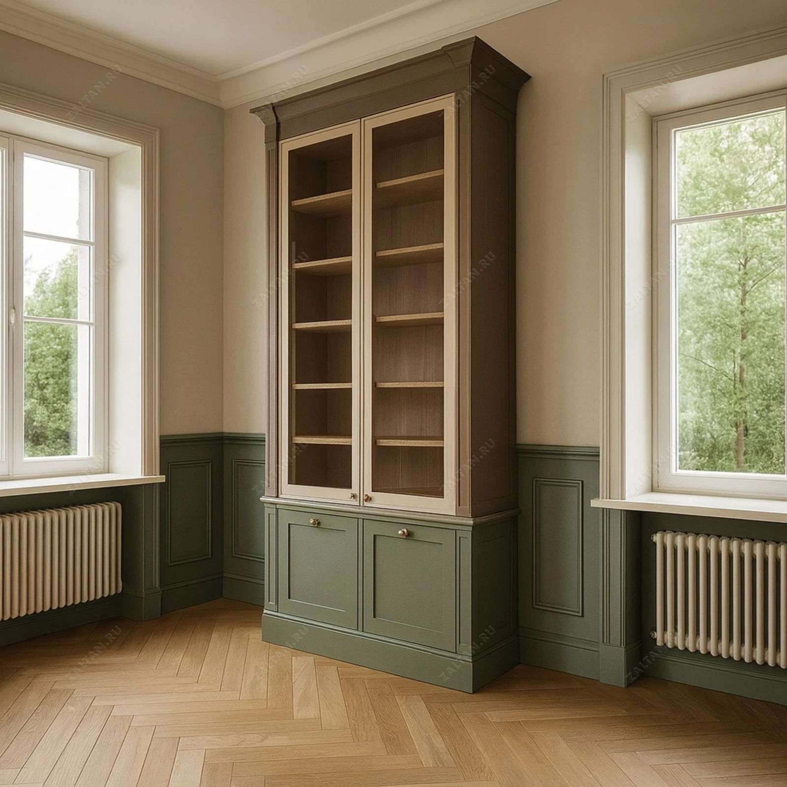 Элегантная корпусная витрина в неоклассическом стиле — шпонированный верх с витражными дверцами и закрытый цокольный модуль. Идеальна для гостиной или библиотеки, выполняется под индивидуальный размер.