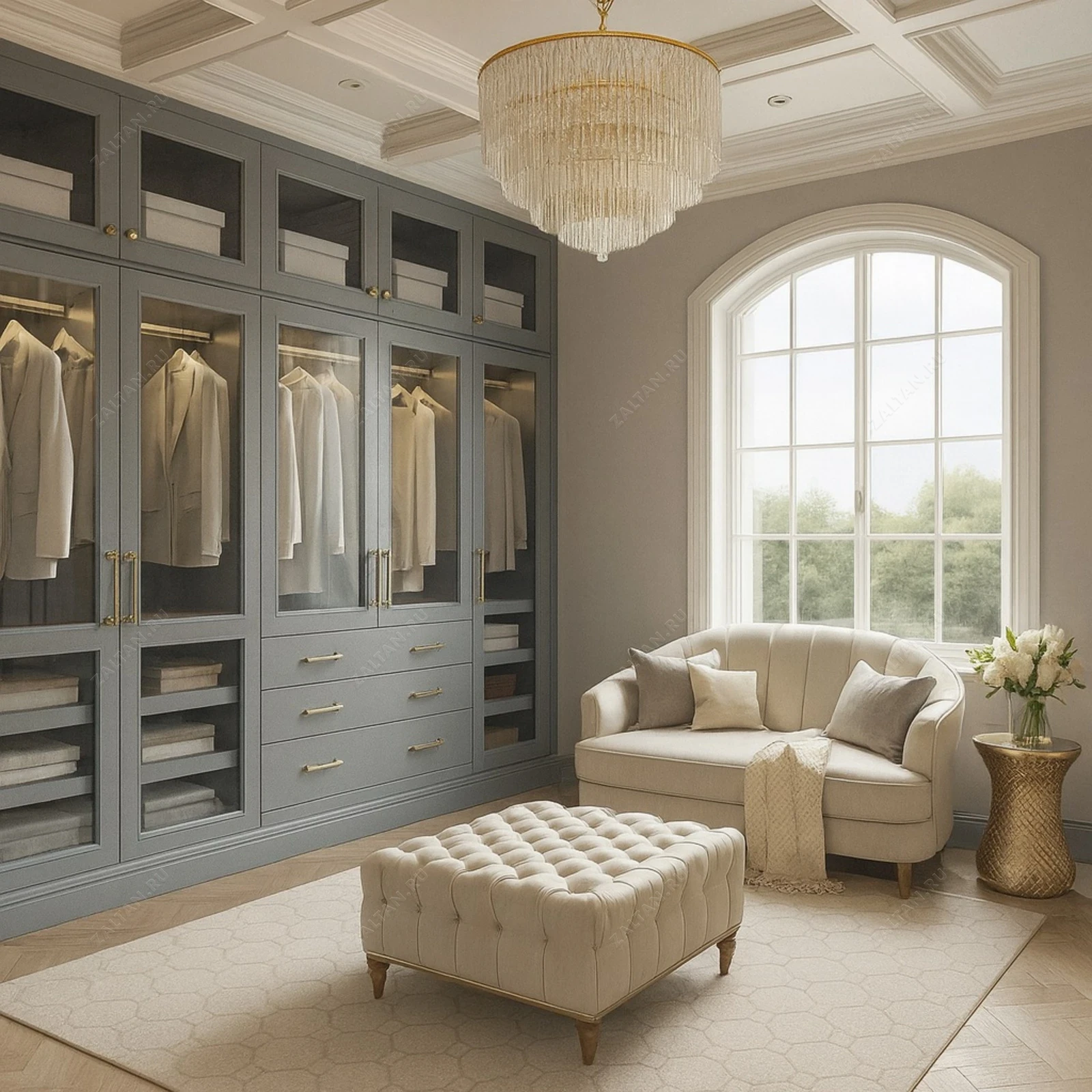 Элегантная встроенная гардеробная на заказ — сочетание неоклассики и современного удобства. Каркас и фасады выполнены в спокойном сером тоне с витринированными дверцами, латунной фурнитурой и интегрированной подсветкой — решение для тех, кто ценит порядок и презентабельный вид одежды.