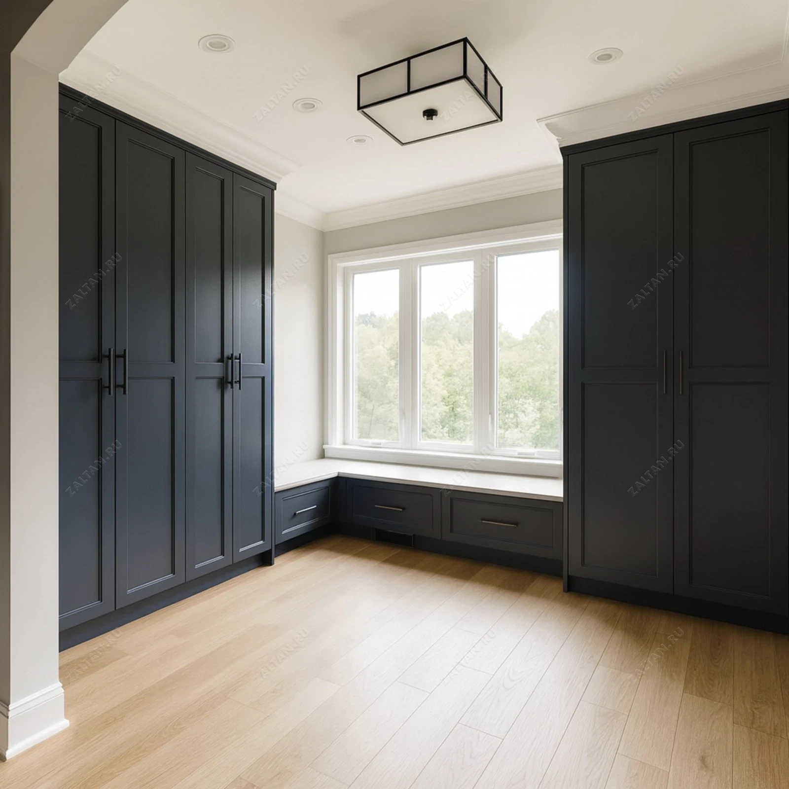 Индивидуальная встроенная гардеробная премиум-класса, выполненная под заказ. Композиция включает два высоких шкафа и встроенную скамью с выдвижными ящиками под окном — практичное решение для хранения и зоны отдыха.