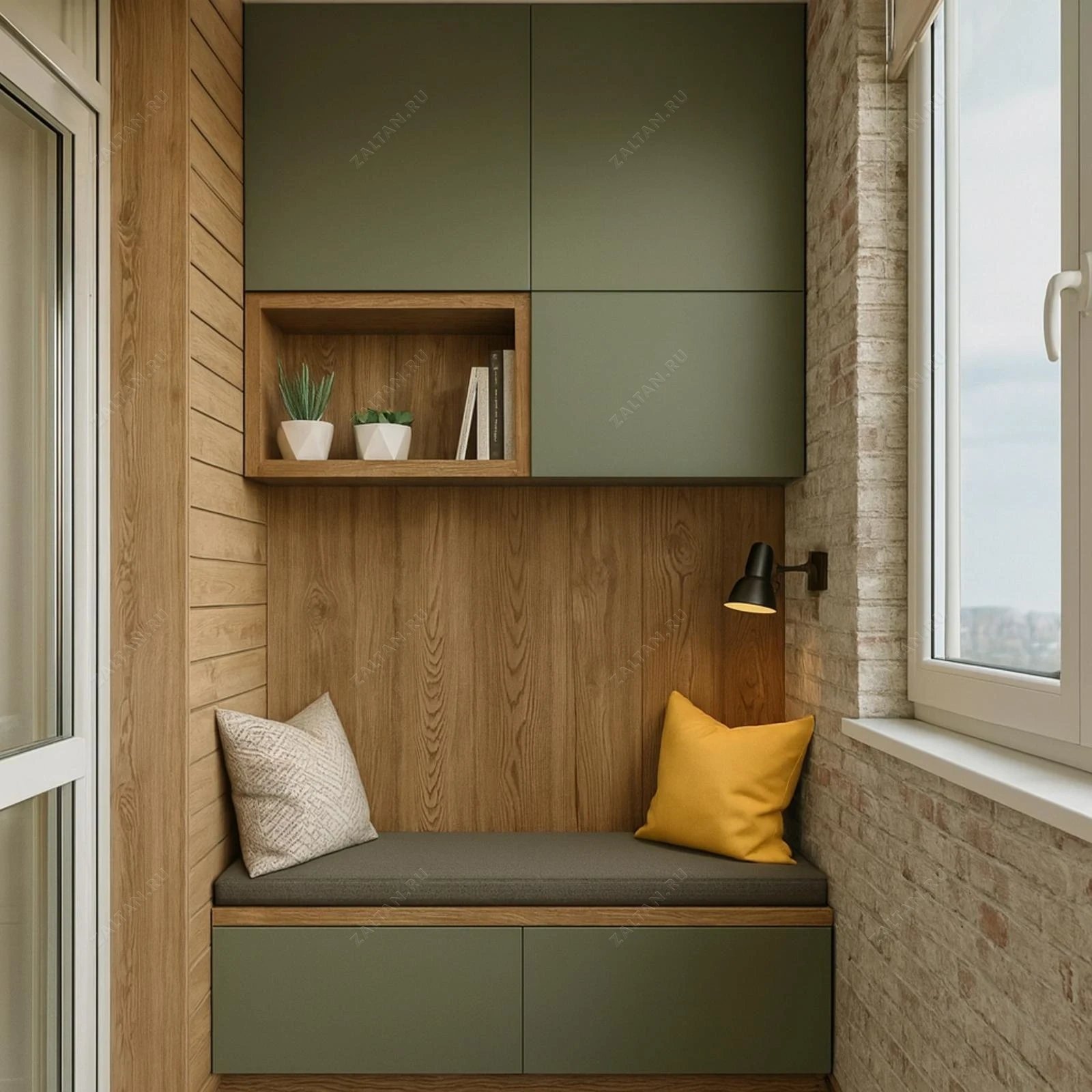 Компактная встроенная лавка для балкона с функциональными шкафчиками и открытой нишей. Изготовлена по индивидуальным размерам с акцентом на премиальное качество: матовые зелёные фасады в сочетании со шпоном дуба создают тёплый и современный облик.