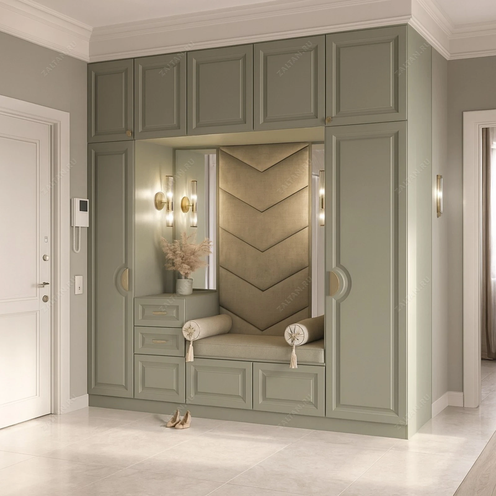 Элегантная встроенная прихожая с мягкой банкеткой — решение для тех, кто ценит премиальное качество и продуманный функционал. Корпус и филёнчатые фасады выполнены в матовой эмали, встроенные антресоли увеличивают место для хранения, а зеркальные вставки визуально расширяют пространство.