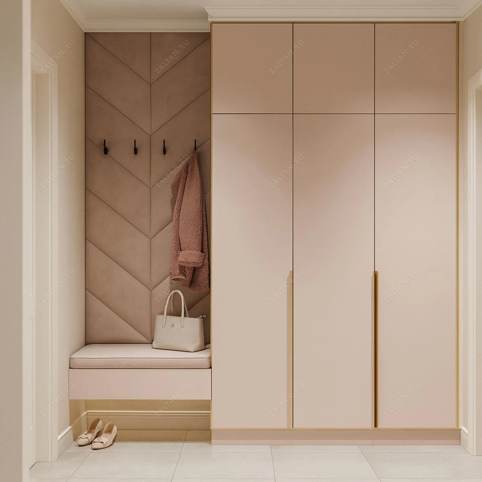 Элегантная встроенная прихожая под заказ: лаконичные фасады в нежно-розовом тоне с золотой интегрированной ручкой и мягкой банкеткой в нише. Идеальное решение для компактных коридоров — сочетание вместительного шкафа и открытой посадочной зоны.
