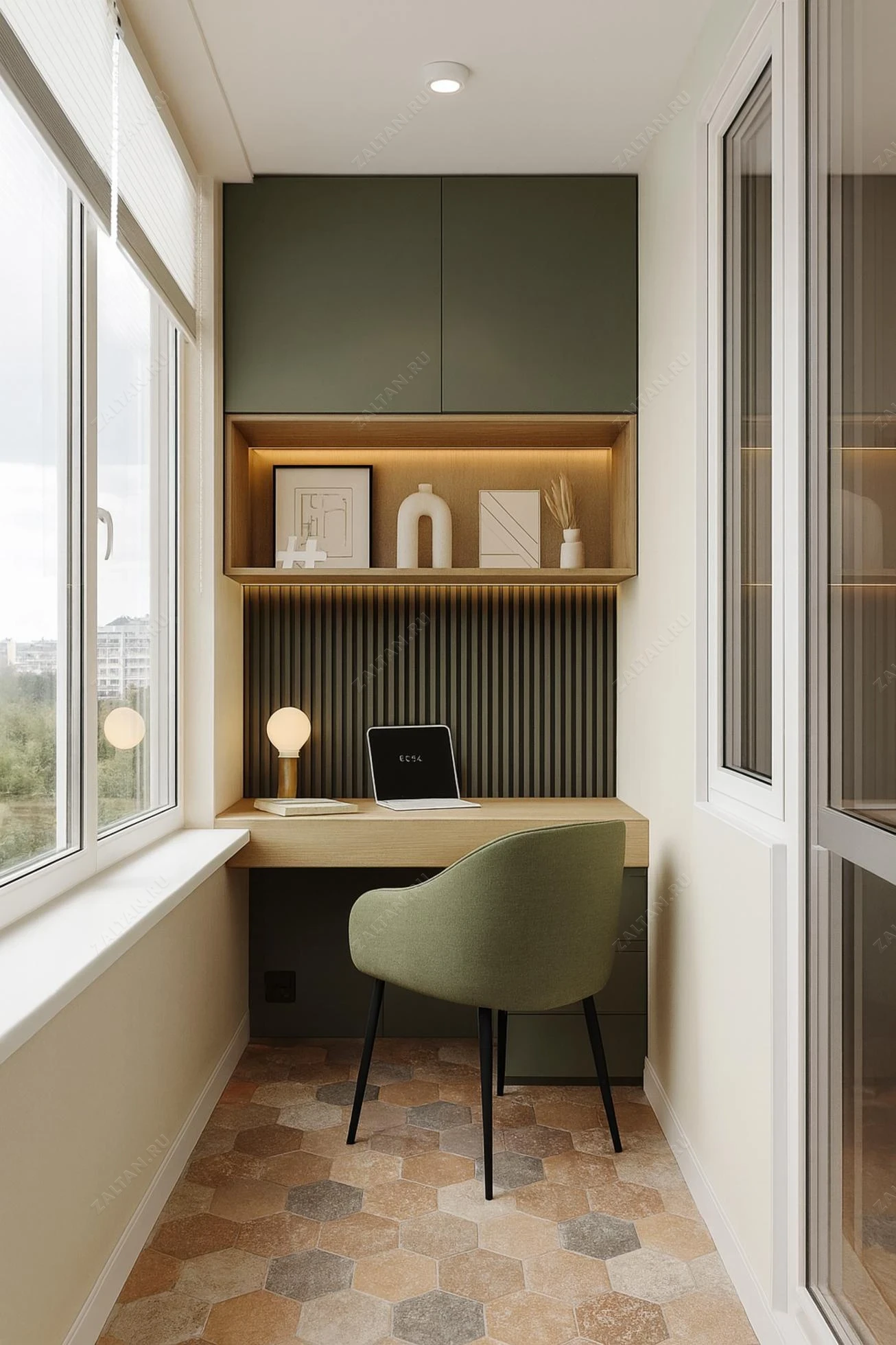 Индивидуальная встроенная рабочая зона для балкона — решение премиум-класса от фабрики мебели. Минималистичный дизайн, матовые зелёные фасады и деревянные поверхности создают атмосферу уюта и концентрации.