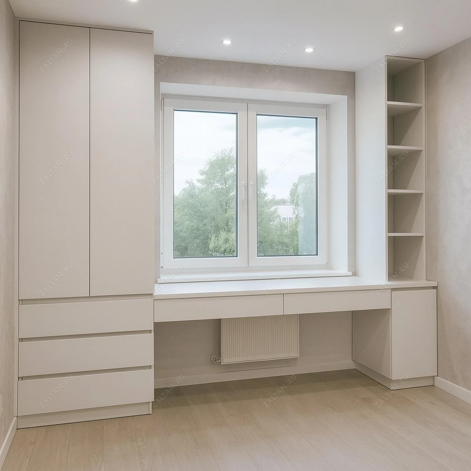 Индивидуальная встроенная рабочая зона в светлом матовом оформлении — сочетание функциональности и минималистичной эстетики. Выполняется по размерам ниши, с отделением под радиатор и выдвижными ящиками для организации хранения.