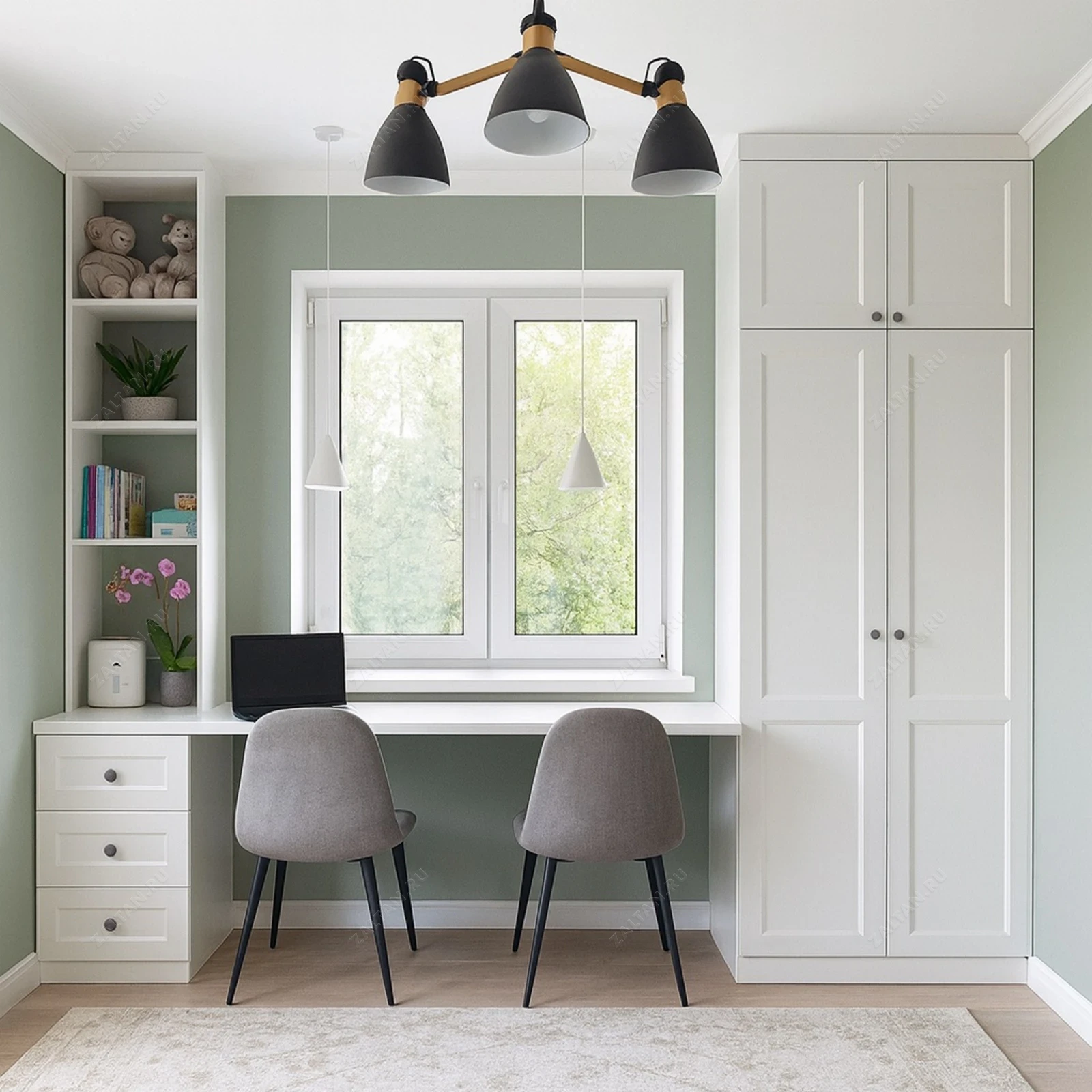 Компактная встроенная рабочая зона под окно с высоким платяным шкафом и открытым стеллажом. Дизайн в скандинавском стиле: белые фрезерованные фасады из МДФ с эмалевым покрытием, практичная тумба с ящиками и просторная столешница на двоих.