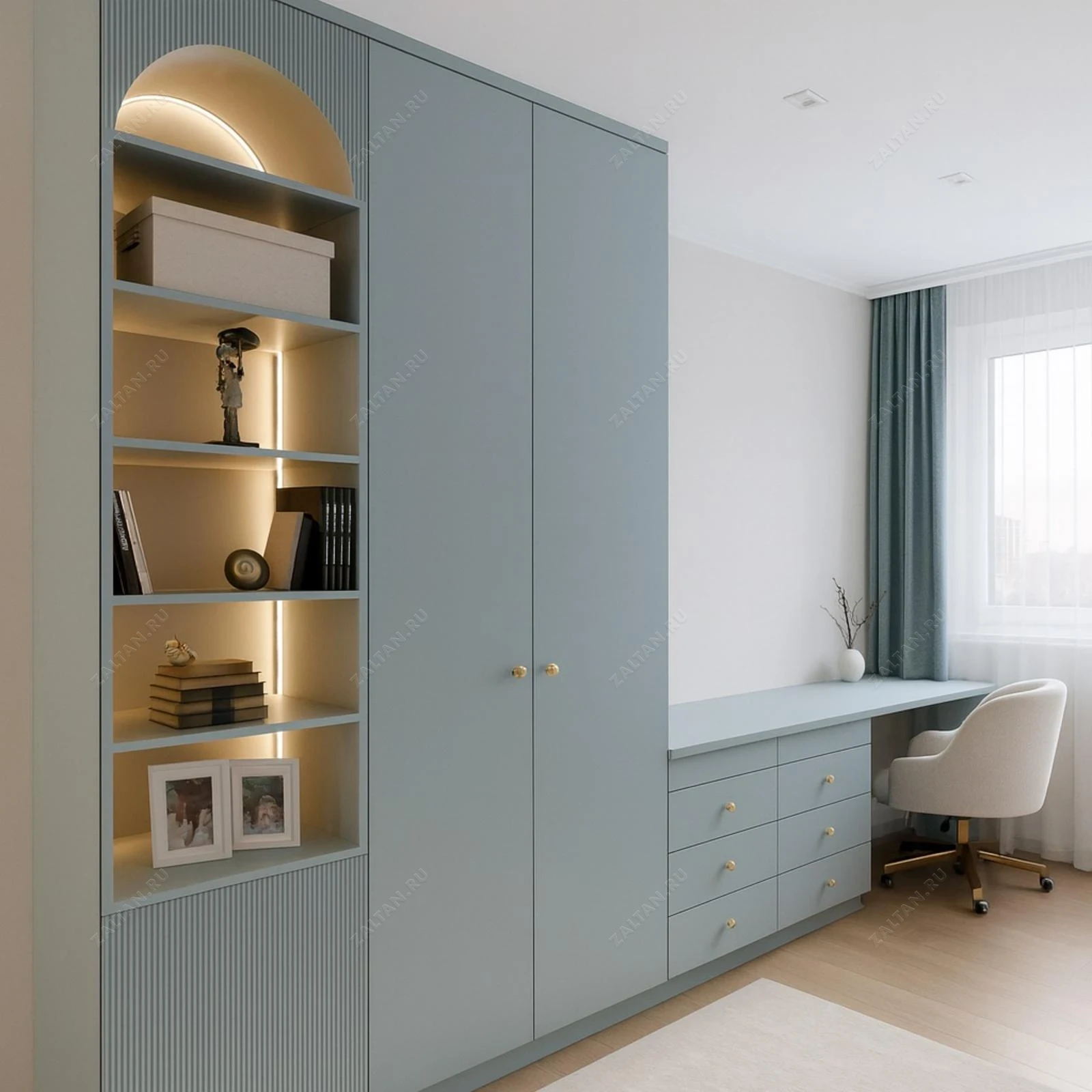 Комплект из встроенного шкафа с открытыми полками и интегрированной рабочей зоной — решение для спокойного, светлого кабинета или спальни. Чёткие минималистичные фасады и рифлёная панель создают аккуратный акцент, а тёплая встроенная подсветка в нишах подчёркивает экспозицию предметов.
