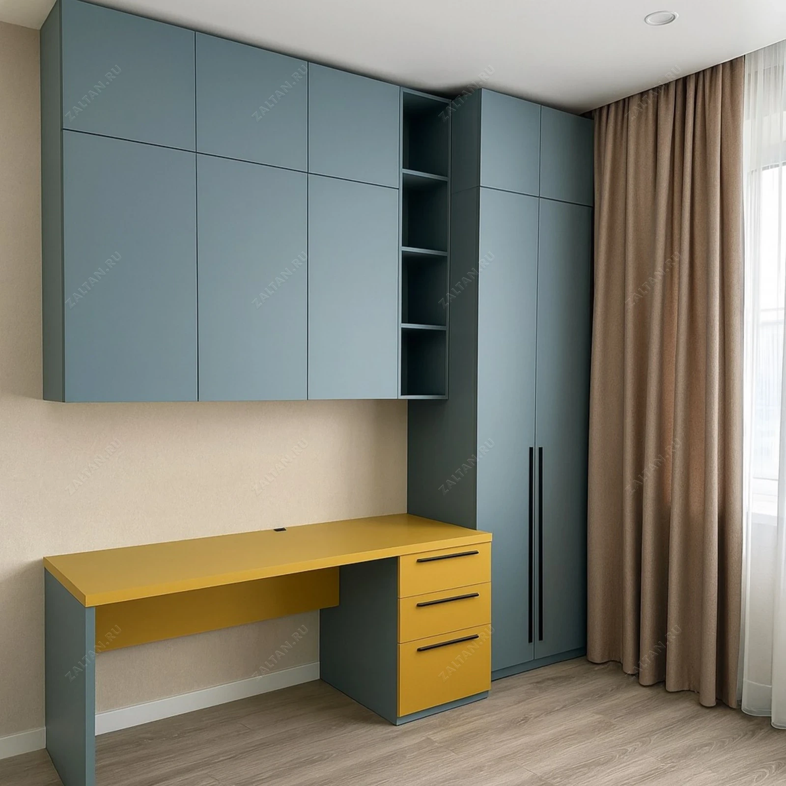 Компактная встроенная рабочая зона с высоким шкафом и выдвижной тумбой. Матовые глубокие фасады в холодной палитре гармонично контрастируют с тёплой жёлтой столешницей, создавая аккуратный акцент.