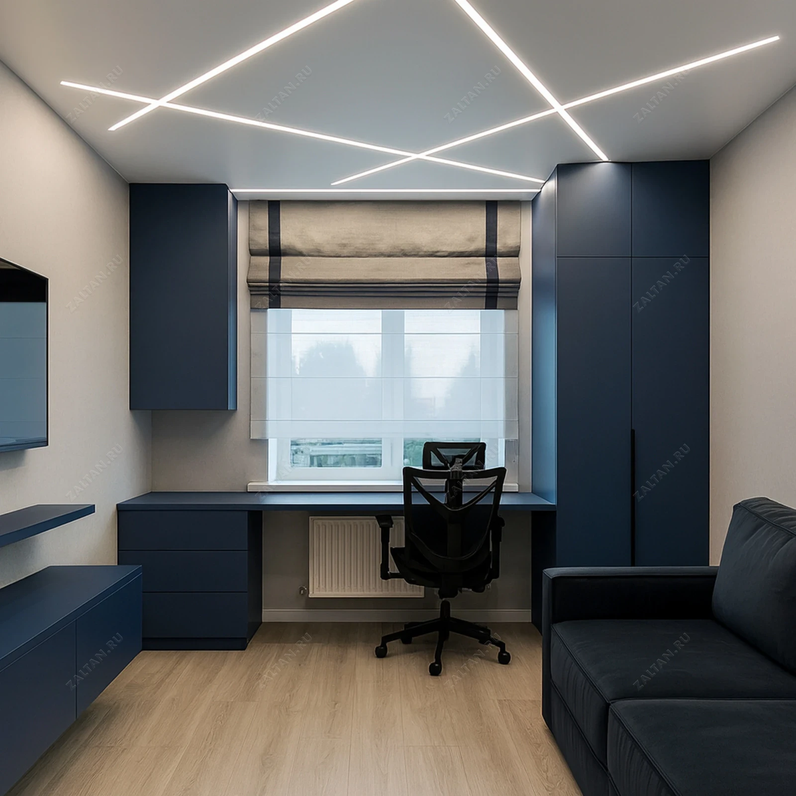 Компактная встроенная рабочая зона в современном стиле: глубина стола для комфортной работы, высокий пенал для хранения и навесные модули над столешницей. Матовый синий фасад в сочетании с нейтральными стенами создаёт спокойный рабочий фон.