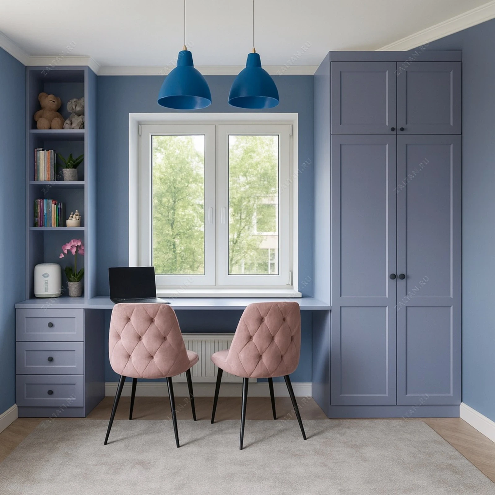 Индивидуальная встроенная рабочая зона с платяным шкафом и открытыми полками — элегантное решение для кабинета или спальни. Корпус и фрезерованные фасады из крашеного МДФ с матовой поверхностью обеспечивают премиальный вид и стойкость к износу.