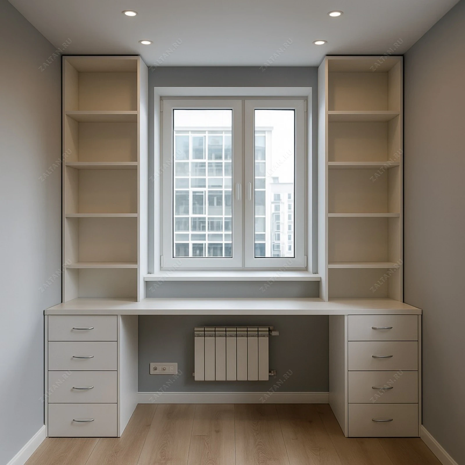 Индивидуальная встроенная рабочая зона под окно — функциональное и чистое решение для кабинета или спальни. Корпусные тумбы с четырьмя ящиками по бокам сочетаются с открытыми стеллажами до потолка, обеспечивая удобный доступ и визуальную лёгкость.