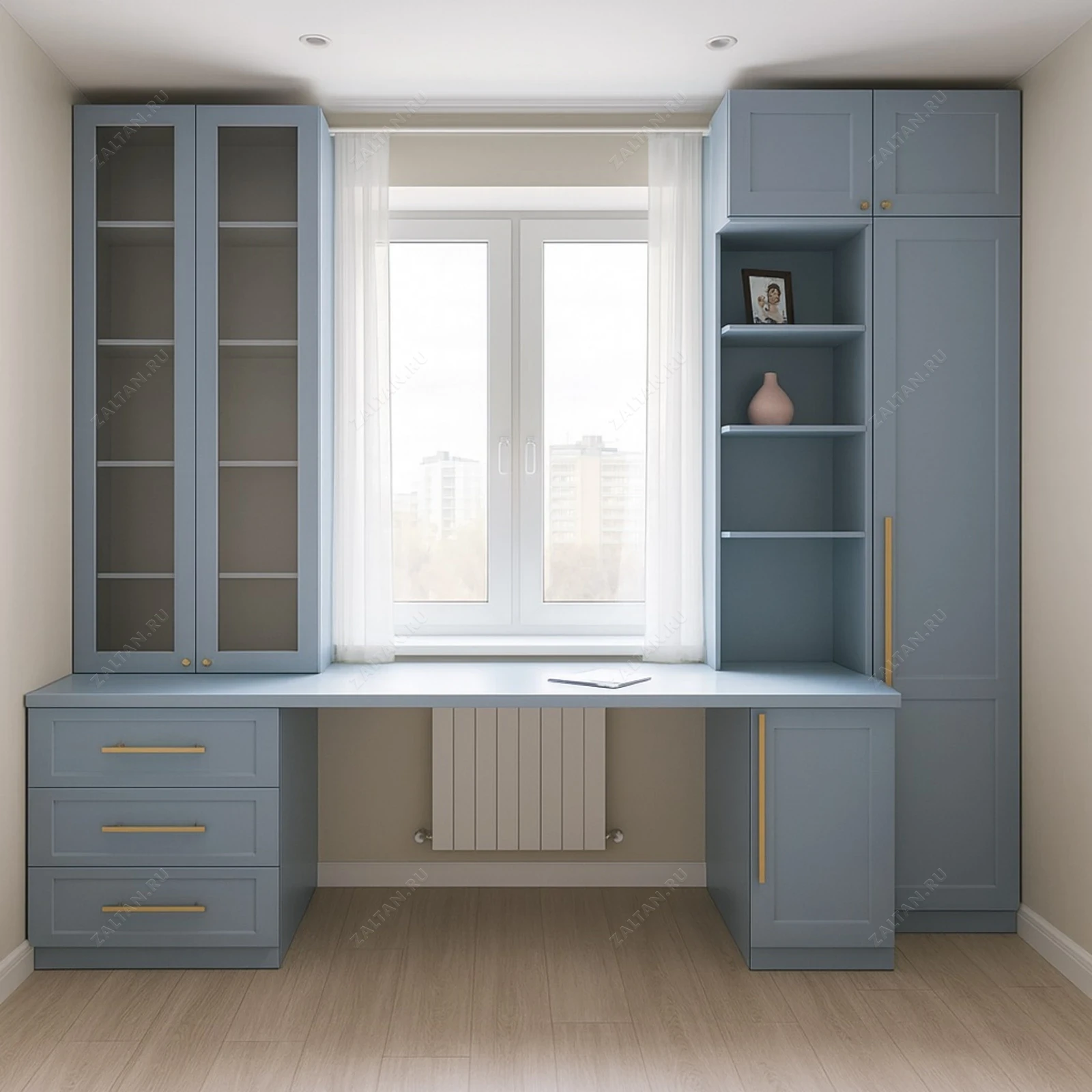 Индивидуальная встроенная рабочая зона вокруг окна — сочетание функциональности и премиального исполнения. Изделие выполнено в спокойном синем тоне с матовой фрезерованной фасадной системой и стеклянной витриной. Рабочая поверхность спроектирована на комфортной высоте, набор шкафов и выдвижных ящиков решает хранение документов и одежды.