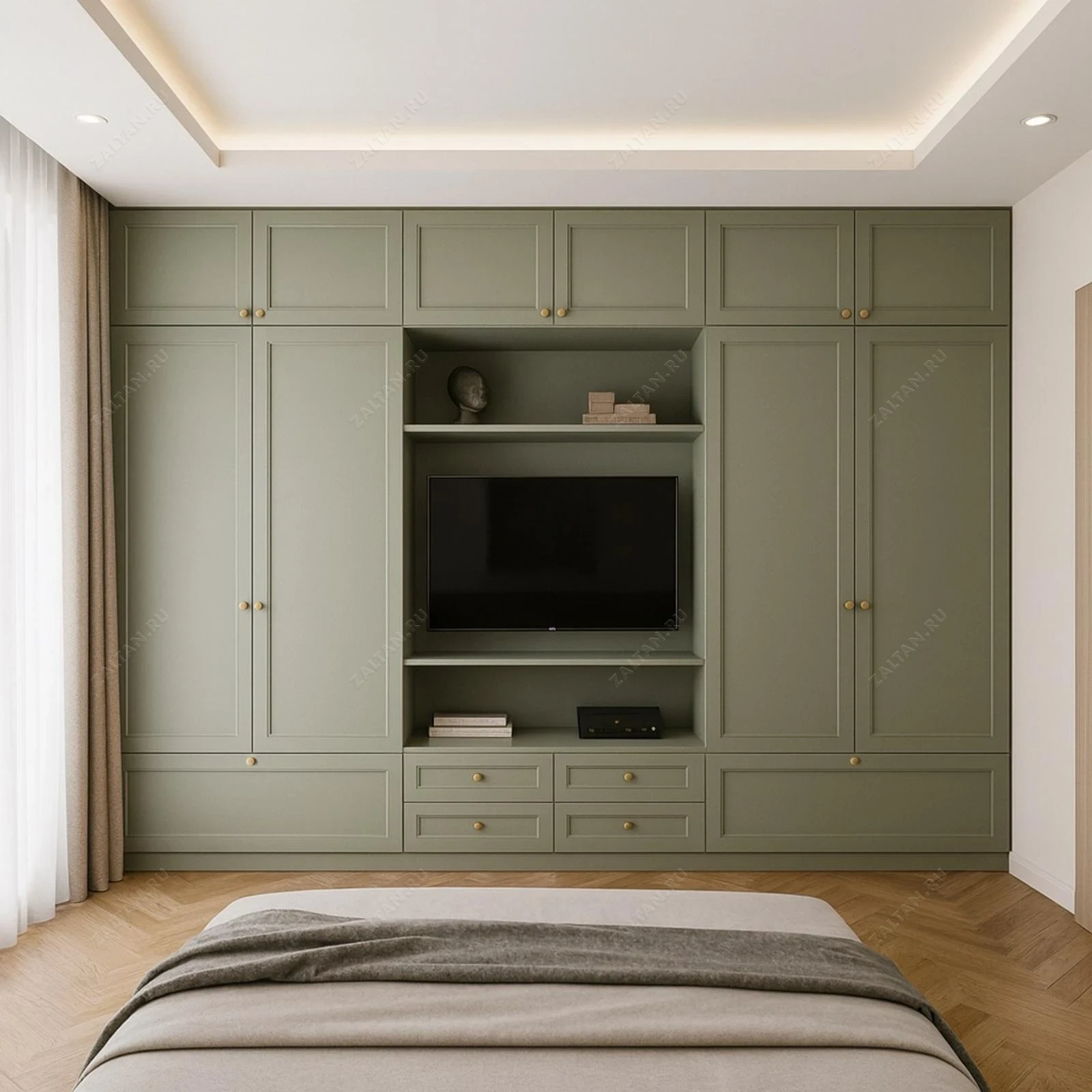 Элегантная встроенная шкаф-стенка для спальни с нишей под телевизор. Матовый зелёный фасад с фрезерованными рамками и латунными ручками подчёркивает неоклассический характер решения.