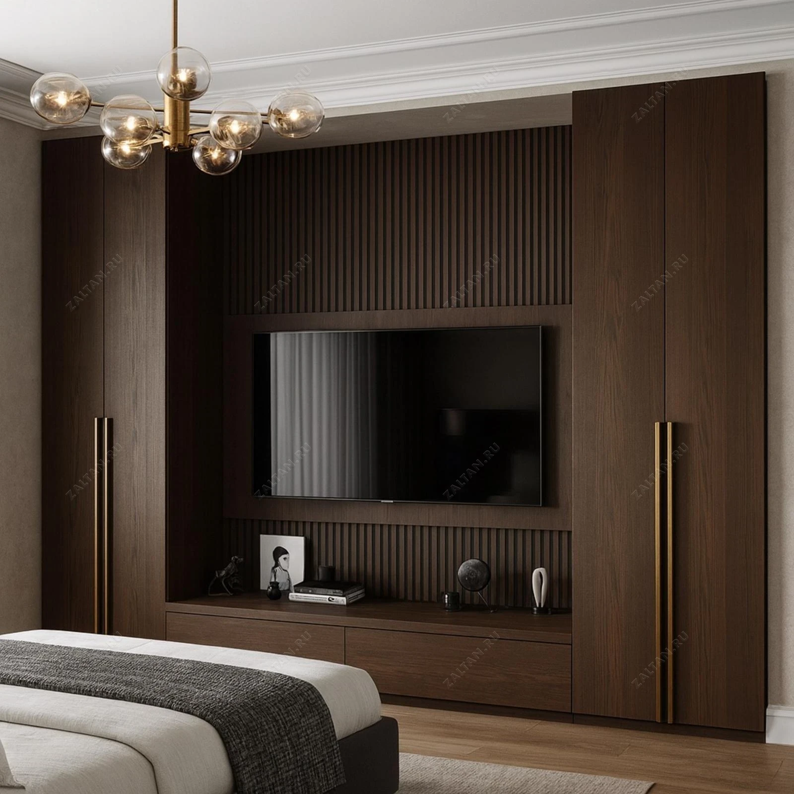 Элегантная встроенная стенка под ТВ в тёмном древесном шпоне. Композиция включает два высоких пенала с длинными латунными ручками и низкую тумбу с выдвижными ящиками. За экраном — реечная декоративная панель для глубины и акустики.