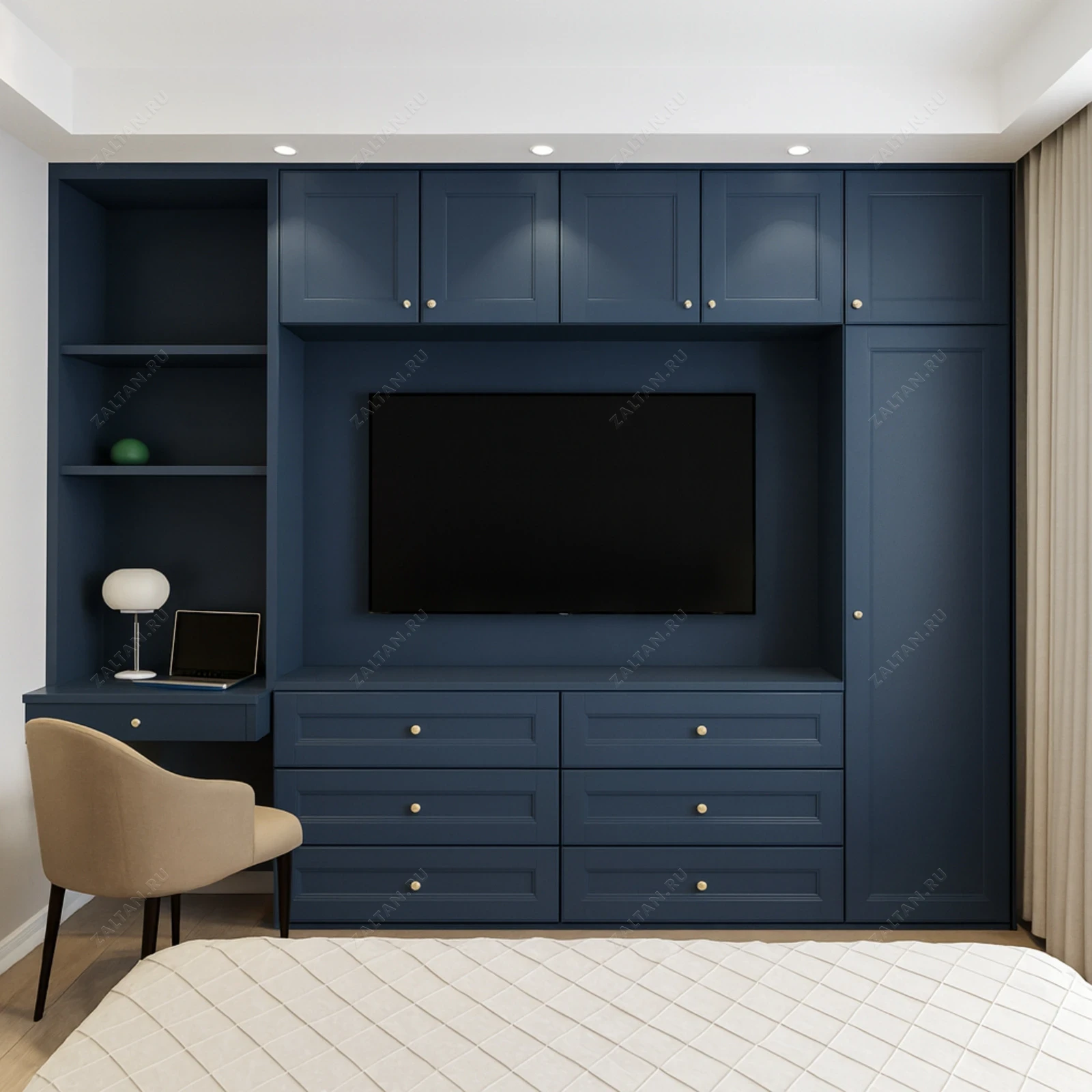 Анализ: модульная встроенная стенка с нишей под телевизор, правым платяным шкафом, нижними широкими ящиками, открытыми полками и небольшой рабочей консолью слева. Фасады — филёнка, матовая покраска, латунные кнопочные ручки.