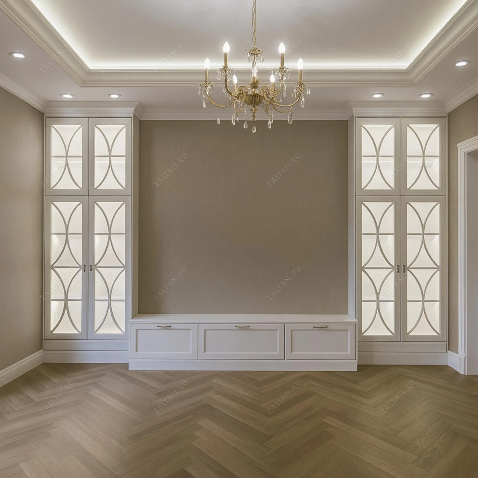 Элегантная встроенная стенка под ТВ с двумя высокими витринами и низкой тумбой. Выполнена в неоклассическом стиле: строгие филёнки, декоративные раскладки на стекле и мягкая встроенная подсветка витрин.