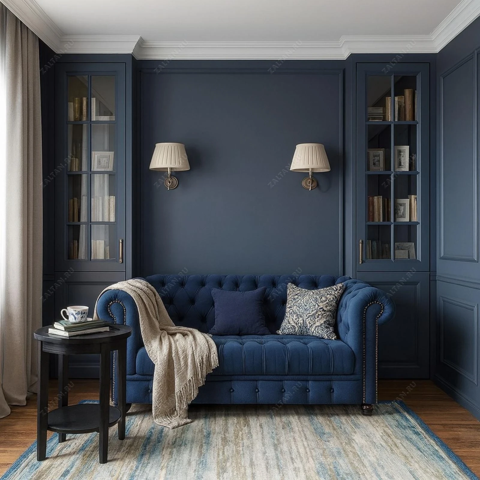 Элегантная встроенная стенка премиум-класса, выполненная в глубоком синем тоне с витражными вставками и панельными фрезеровками. Идеальна для гостиной или кабинета, сочетает хранилище и демонстрационные секции.