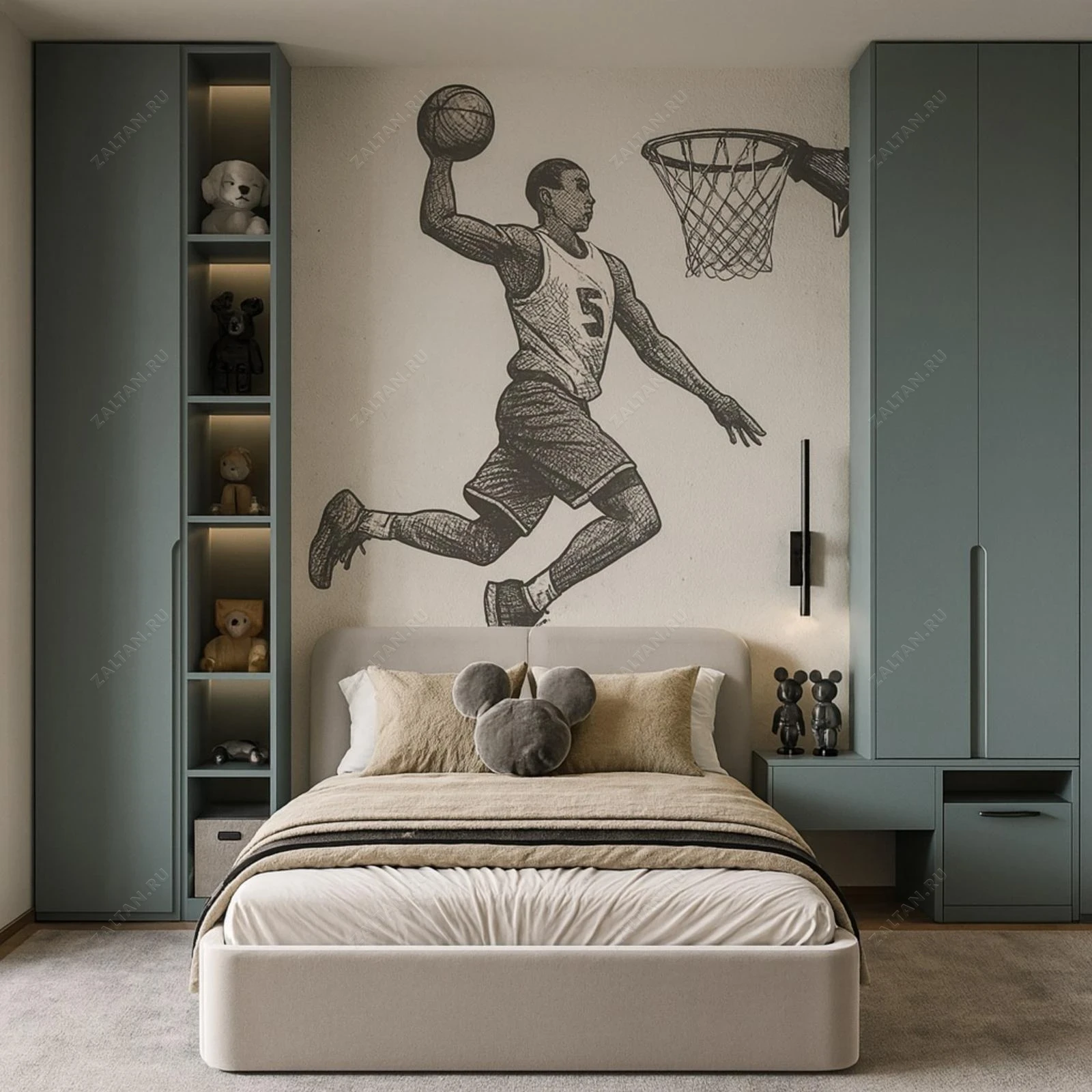 Комплект встроенной мебели вокруг кровати — продуманное решение для спальни. Изделие выполнено в матовой окраске на основе МДФ, с интегрированными вертикальными открытыми нишами и скрытыми ручками. Подходит для хранения одежды, белья и мелочей, возможны встроенные подсветка и выдвижные ящики.