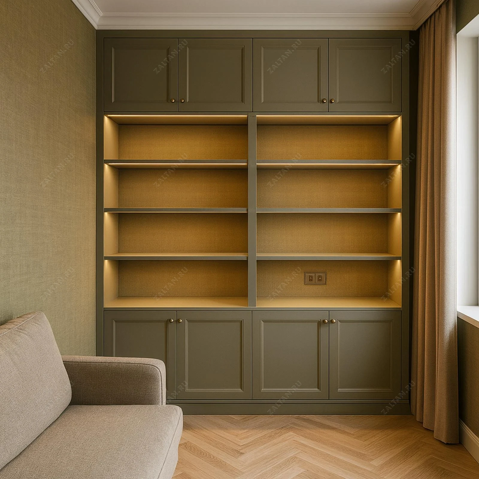 Элегантный встроенный книжный шкаф в неоклассическом стиле, выполненный на заказ. Корпус и фрезерованные фасады из МДФ с матовой эмалевой окраской, золотистые ручки и текстильная облицовка задней стенки создают тёплый, премиальный интерьер.