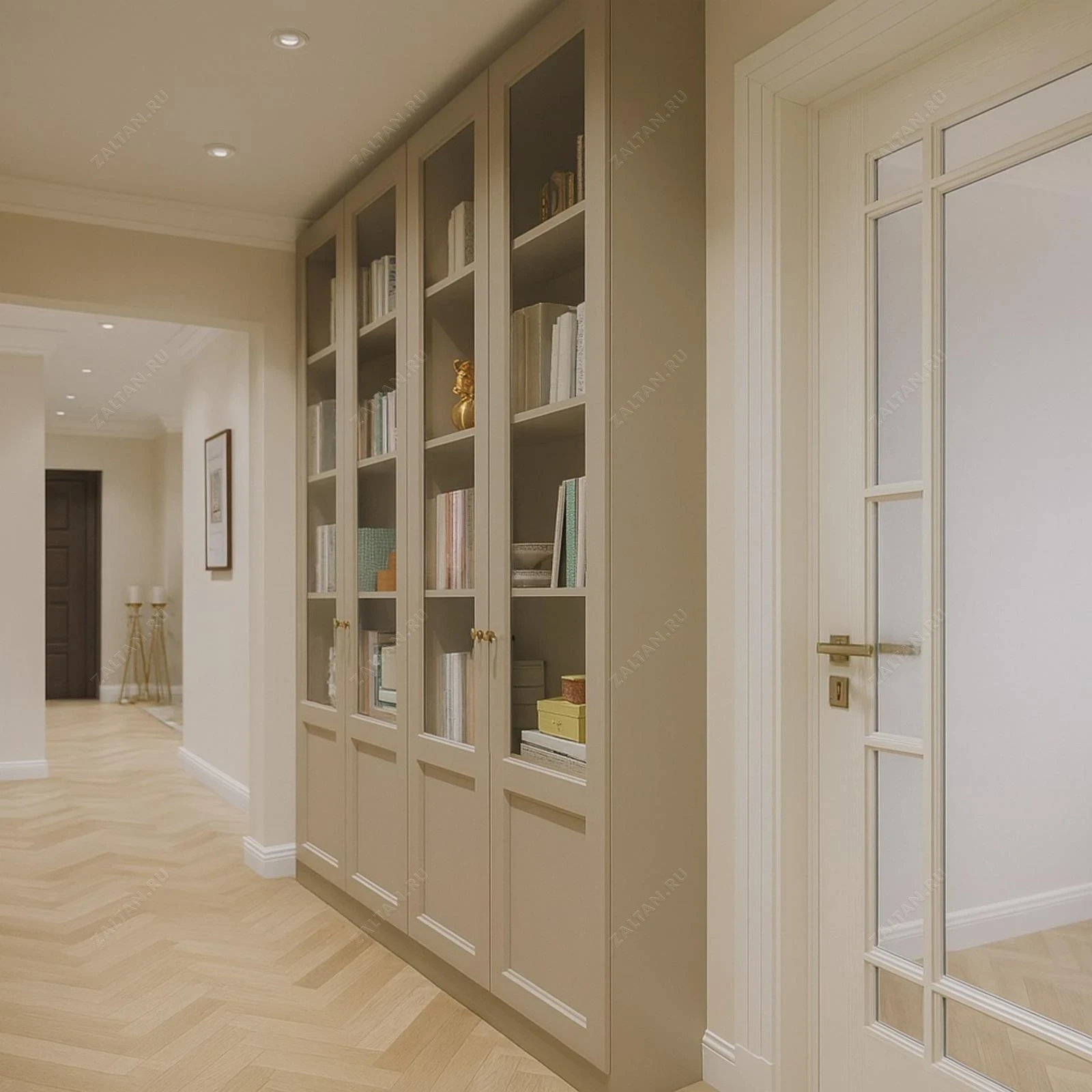 Элегантный встроенный шкаф-стеллаж в неоклассическом стиле — решение для прихожей и небольшой домашней библиотеки. Верхние дверцы со стеклом демонстрируют книги и декор, нижние филёнчатые полотна скрывают бытовые вещи. Цвет — тёплый бежевый матовый оттенок; фурнитура — латунь/золото.