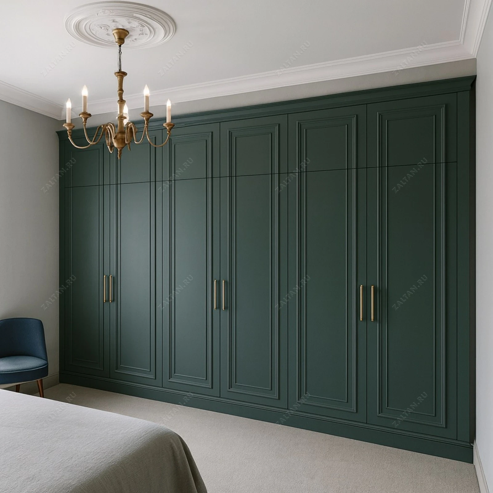 Встроенный платяной шкаф в неоклассическом стиле — аккуратное решение для спальни. Фасады с фрезеровкой и пилястрами выполнены в глубоком матовом зелёном тоне, скрытые петли и длинные латунные ручки подчёркивают премиум-характер.
