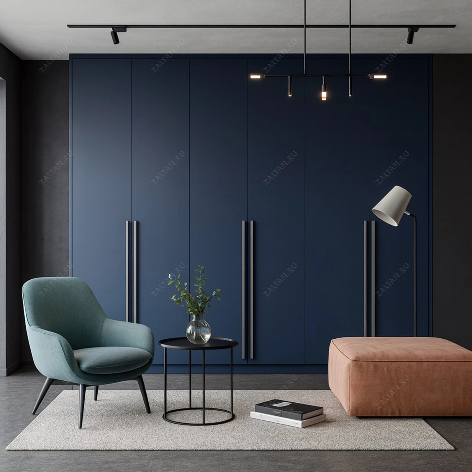 Современный встроенный платяной шкаф в минималистичном стиле. Выполнен под потолок с ровными матовыми фасадами глубокого синего цвета и длинными металлическими ручками — эстетика лаконичного интерьера и удобство в использовании.
