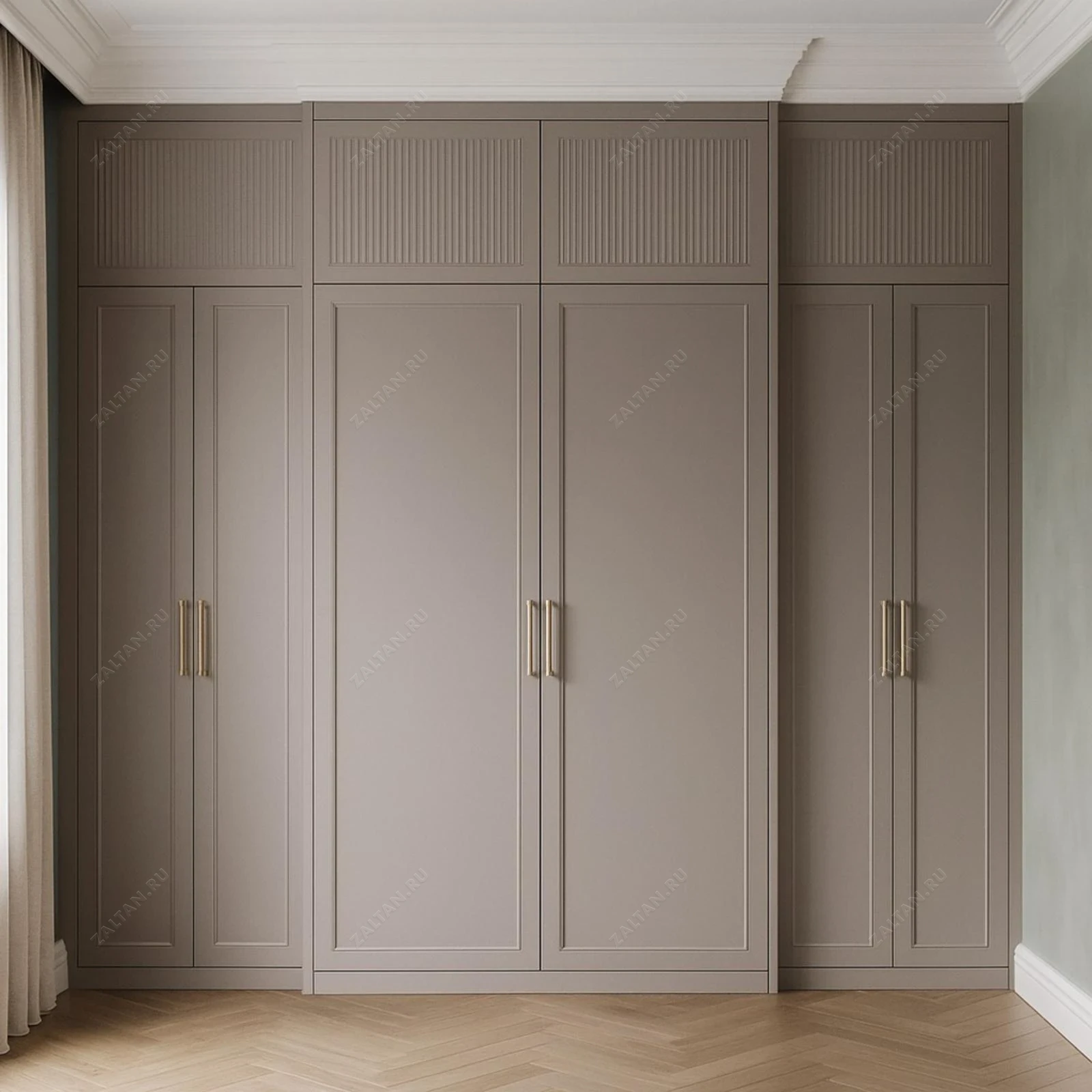 Встроенный платяной шкаф по индивидуальным размерам. Корпус из МДФ с матовой эмалевой отделкой, аккуратные филёнки на фасадах и реечный декор в верхних секциях. Изящные металлические ручки подчёркивают премиальность.