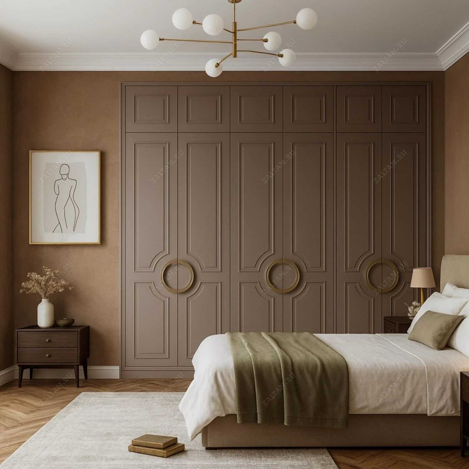 Элегантный встроенный платяной шкаф в неоклассическом стиле — решение для тех, кто ценит премиальное исполнение и гармонию интерьера. Фрезерованные панели в сочетании с крупными круглыми ручками придают фасаду благородный вид, а потолочная ниша и карниз аккуратно завершает композицию.