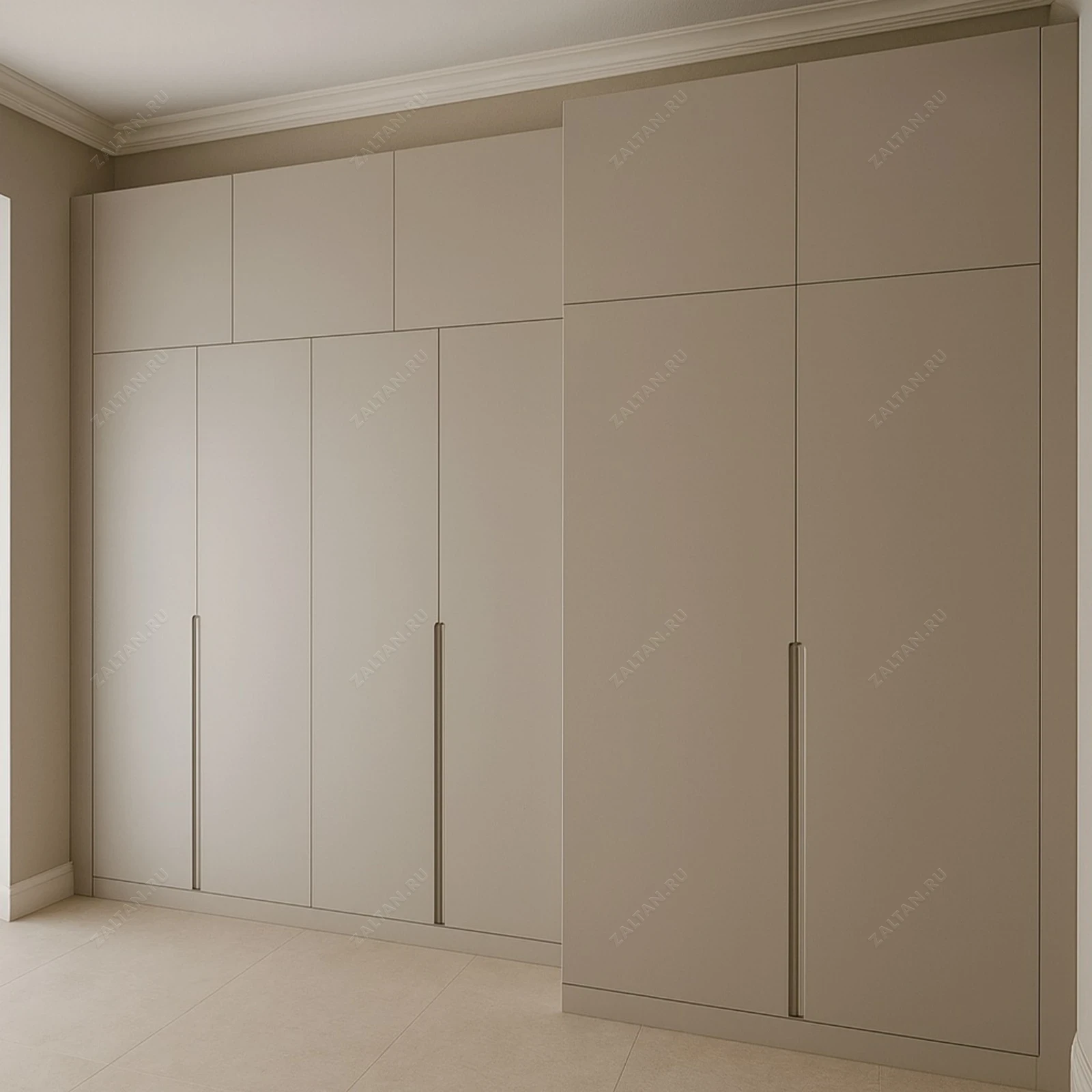Встроенный распашной шкаф премиум-класса, выполнен до потолка в спокойном бежевом тоне. Чистые матовые фасады МДФ, вертикальные интегрированные ручки и верхние антресоли обеспечивают аккуратный и строгий силуэт.