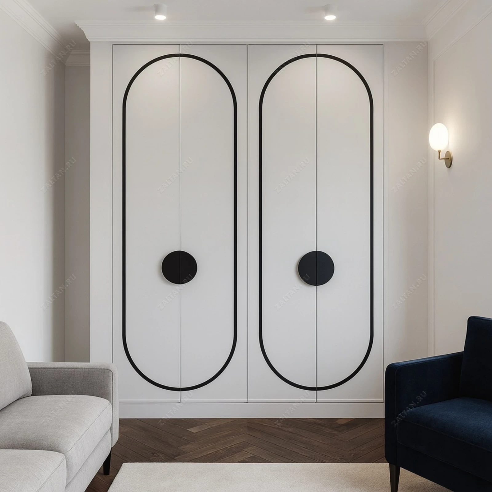 Элегантный встроенный распашной шкаф с декоративной арочной инкрустацией и крупными круглыми ручками. Выполнен в премиальном исполнении: ровные крашеные фасады, скрытые петли и аккуратная интегрированная окантовка.